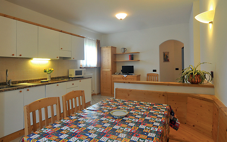 1 ložnice s manželskou postelí, 1 ložnice s palandou, obývací pokoj s kuchyňským koutem a rozkládacím gaučem pro 2 osoby, předsíň, sociální zařízení zpravidla se sprchou, zpravidla balkon; u některých podkrovních apartmánů ložnice pouze se střešním oknem