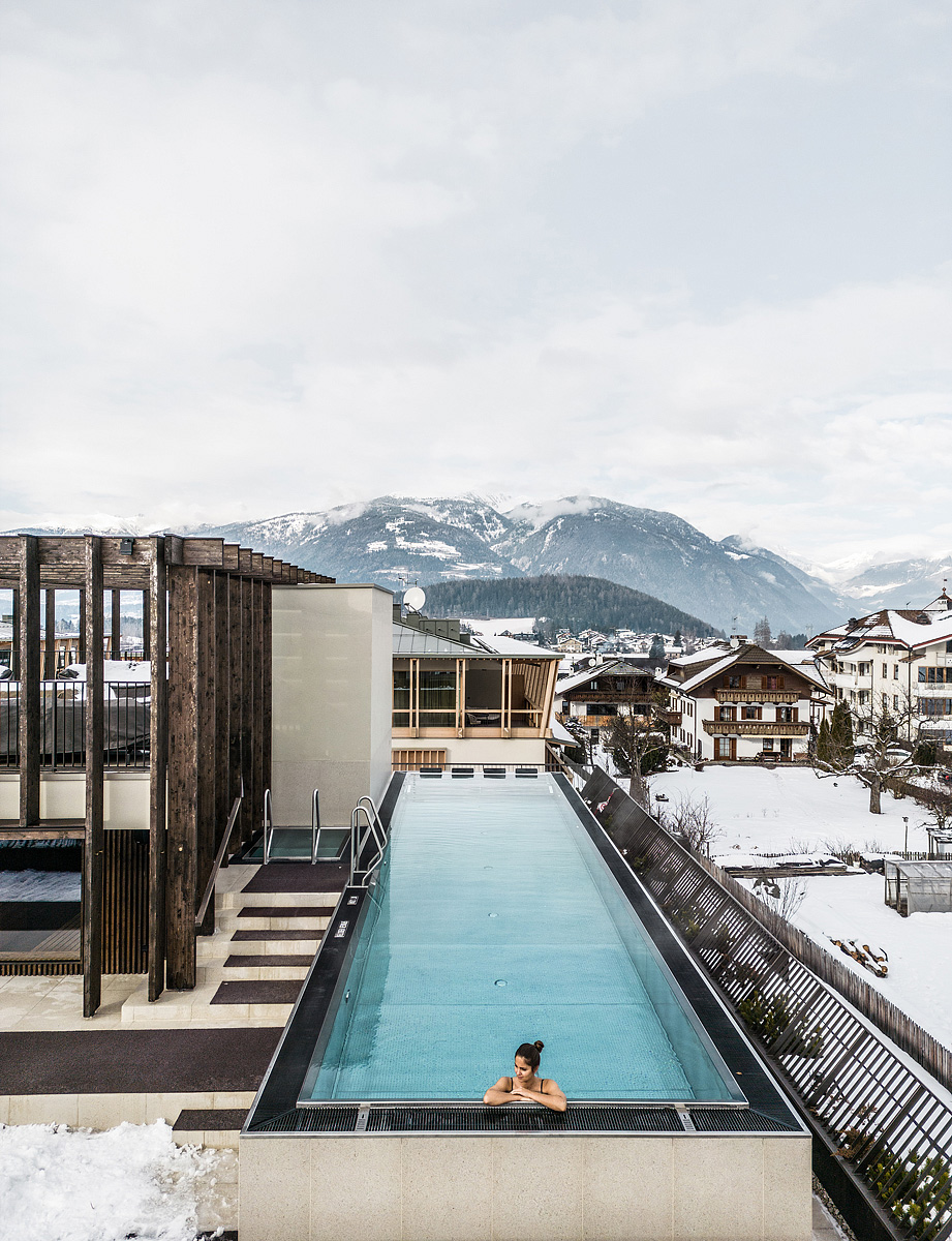 4-podlažní Acquapura Mountain Spa na ploše 1.400 m 2 – venkovní vyhřívaný bazén 25 x 5 m, panoramatický venkovní vyhřívaný bazén#, panoramatická sauna#, biosauna, 2x relaxační koutek s lehátky pro rodiny, 3x relaxační koutek s lehátky#, Private Spa#*, masáže#* a kosmetické služby#*, posilovna# ,tělocvična#, služby označené # mohou využívat osoby od 18 let