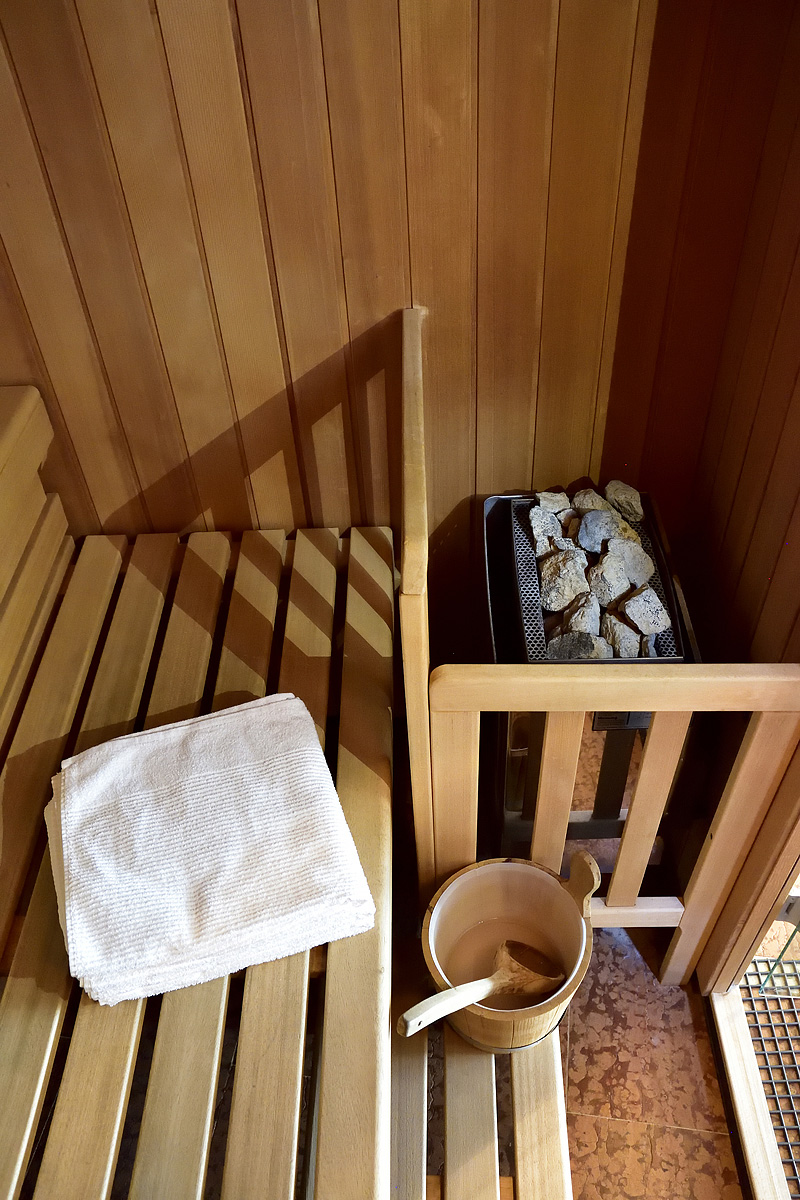 bazén nepravidelného tvaru s lehátky, sauna, 2x hydromasážní vana*, solárium*