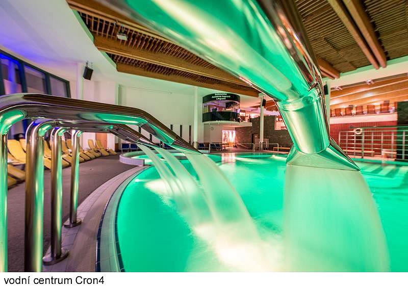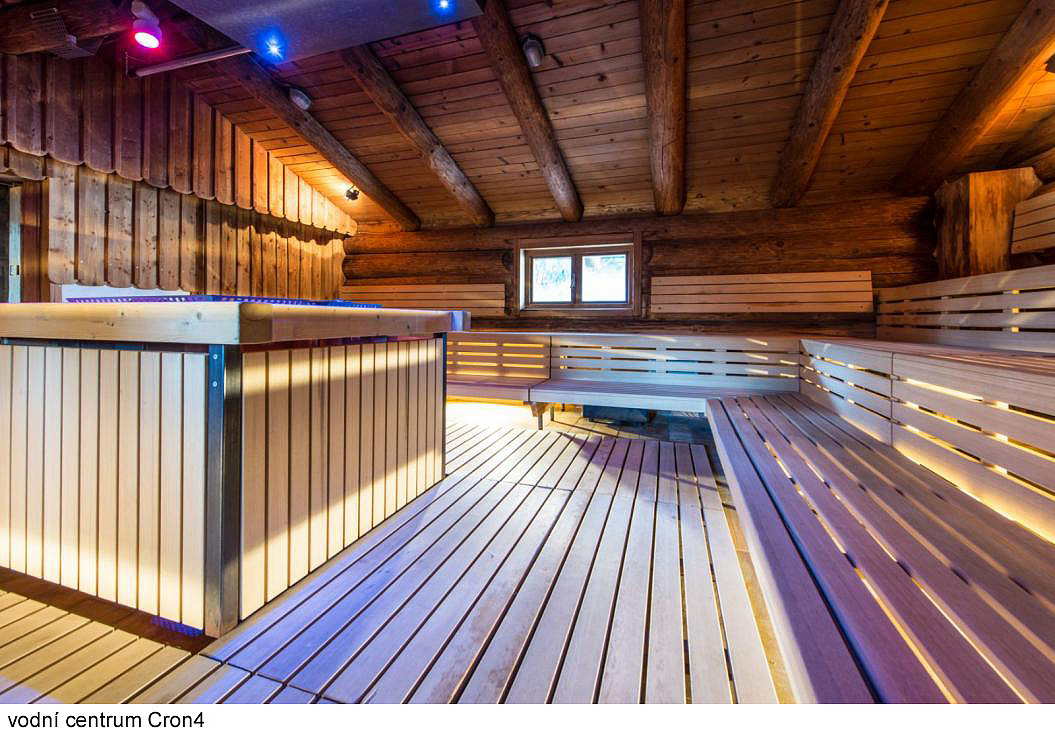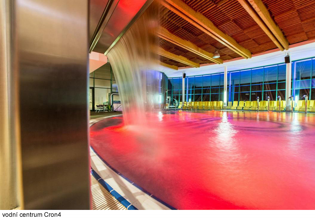 panoramatická sauna#, infrakabina#, 2x relaxační koutek s lehátky#, posilovna#; vodní centrum Cron4 - bazén 25 x 12 m, dětský bazének, bazén 115 m² se slanou vodou, venkovní vyhřívaný bazén, 75 m dlouhý tobogán; služby označené # mohou využívat osoby od 16 let