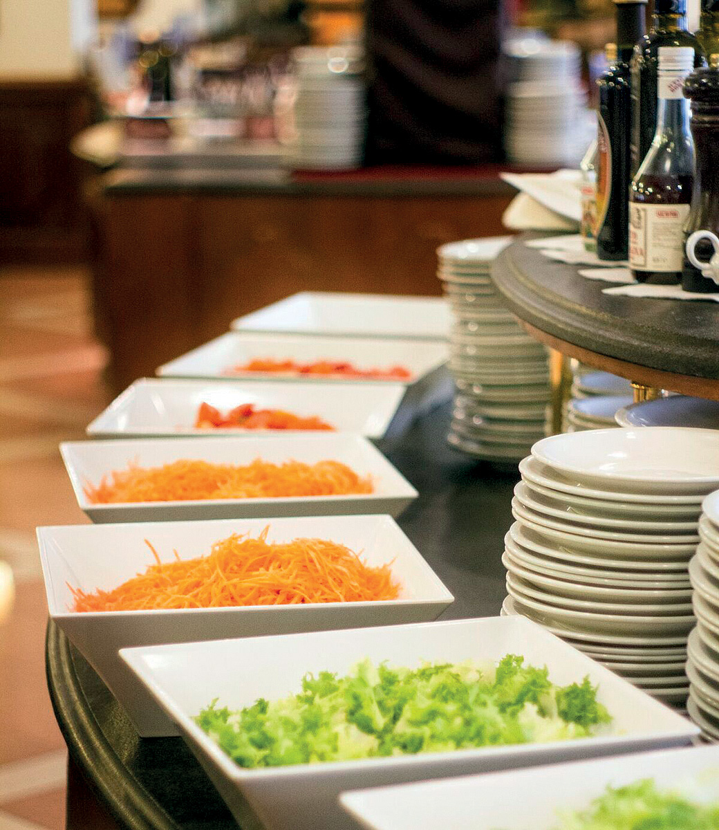 formou bufetu studených a teplých předkrmů, hlavních jídel, příloh, salátů, dezertů, ovoce a sýrů, voda zdarma, ostatní nápoje za poplatek