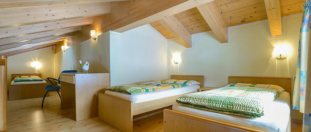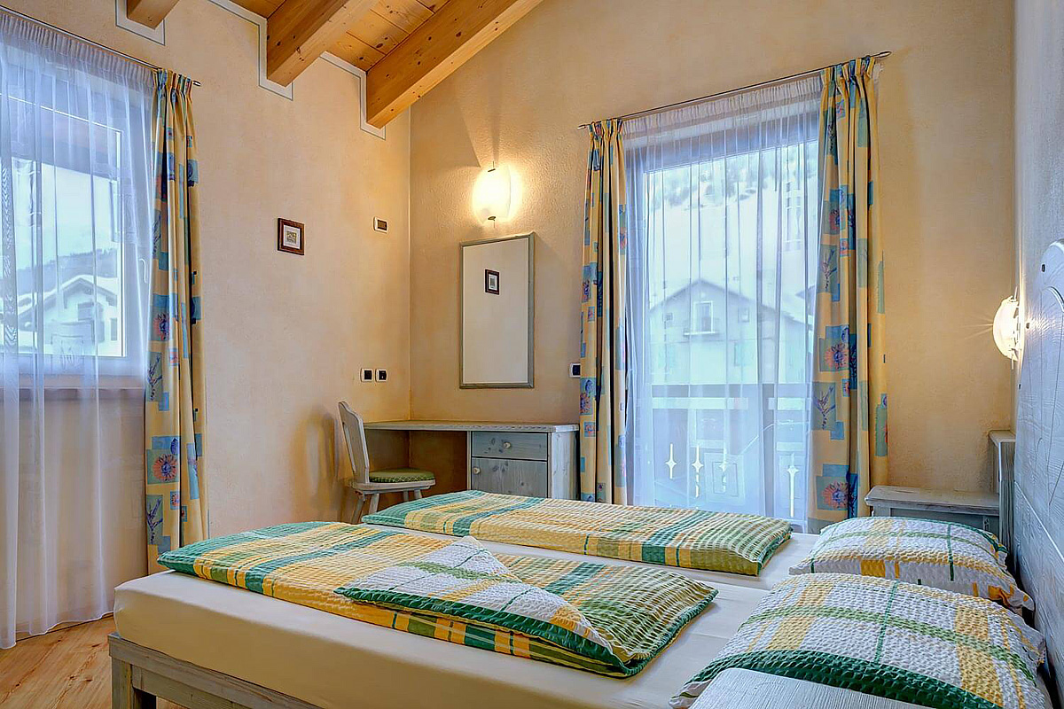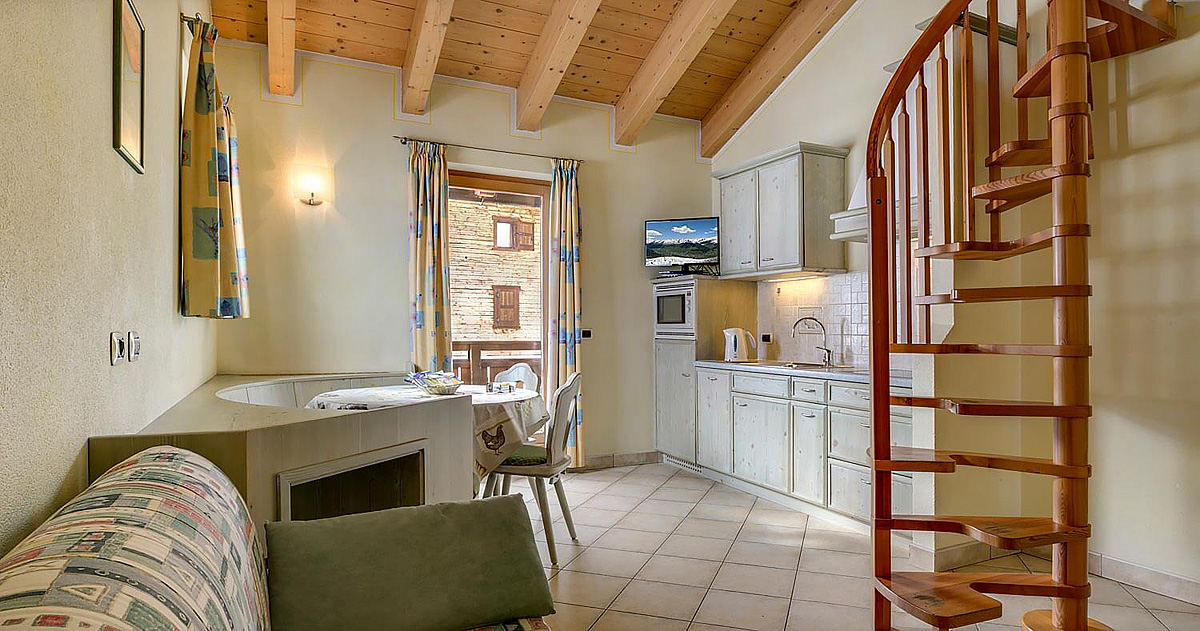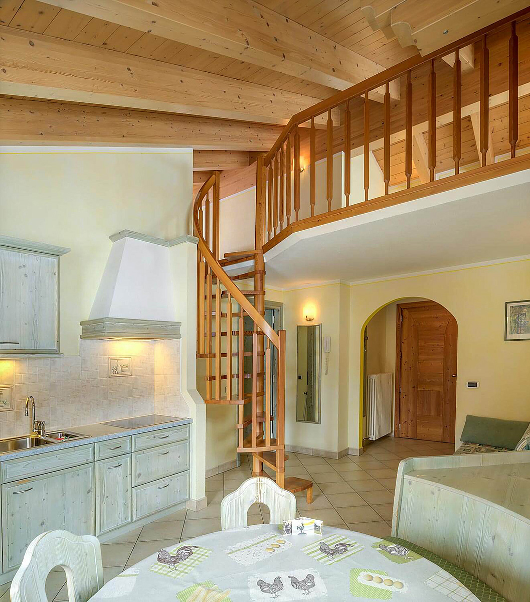 quadri 6/7 - 1. podlaží apartmánu - 1 ložnice s manželskou postelí a balkonem, 1 ložnice se 2 samostatnými lůžky a balkonem, obývací pokoj s kuchyňským koutem a balkonem, sociální zařízení zpravidla se sprchou a vanou; 2. podlaží apartmánu - neuzavřené podkroví se 2/3 lůžky