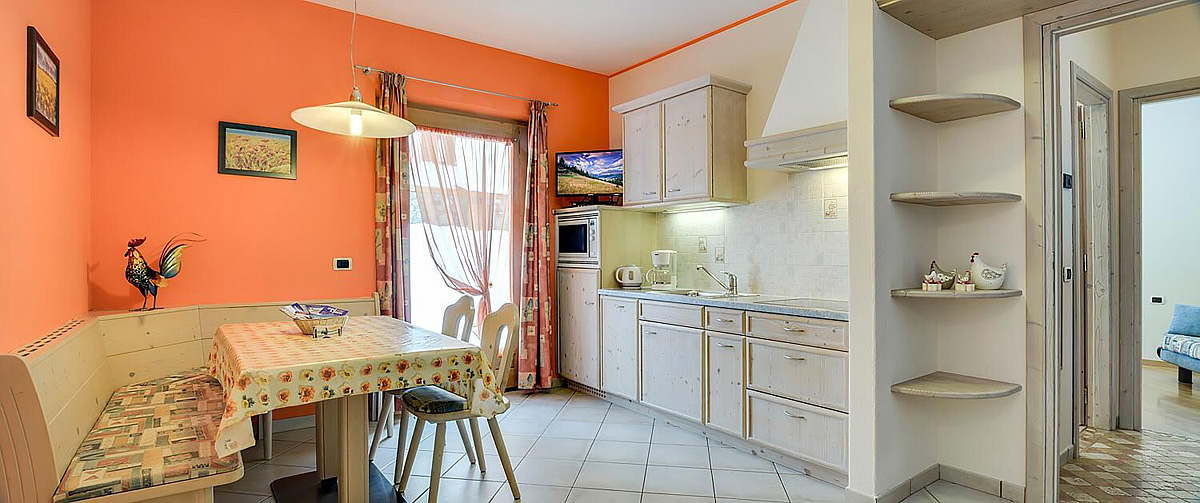 trilo 6 - 1 ložnice s manželskou postelí, 1 ložnice se 2 samostatnými lůžky, obývací pokoj s kuchyňským koutem a rozkládacím gaučem pro 2 osoby, sociální zařízení se sprchou a vanou; apartmán v přízemí