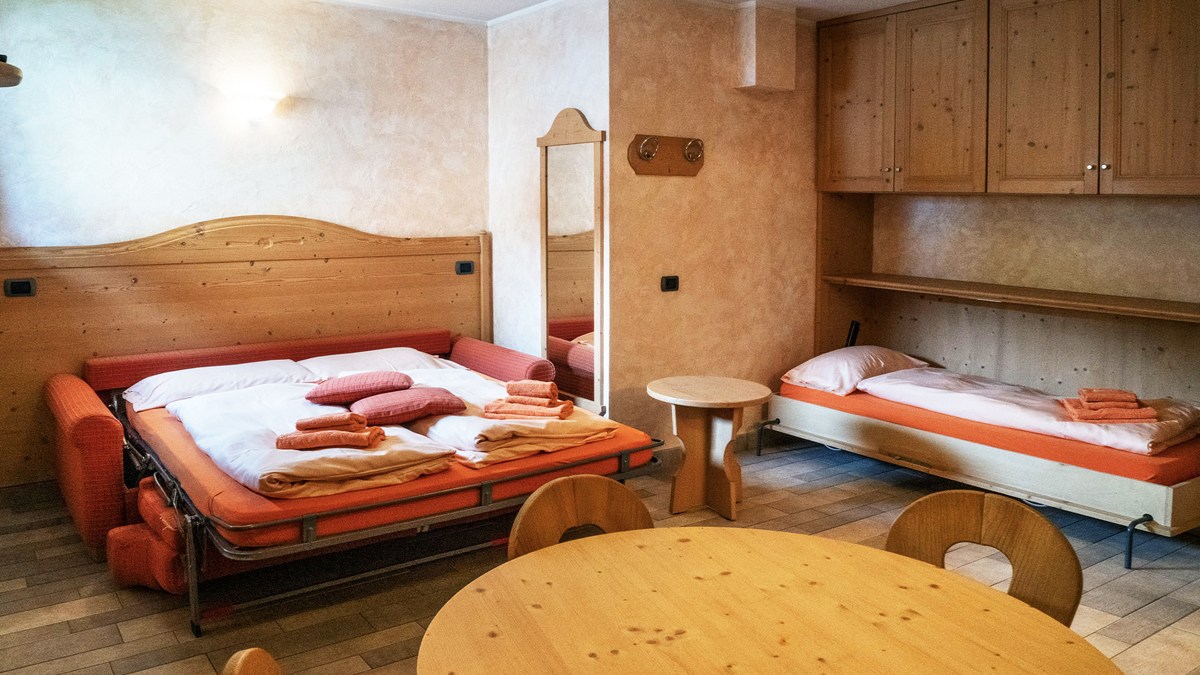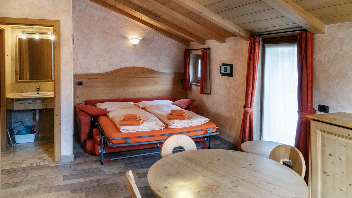 trilo 6/7 - dvoupodlažní; 1. podlaží – obývací pokoj s kuchyňským koutem a rozkládacím gaučem pro 2 osoby, sociální zařízení se sprchou, malý balkon, 2. podlaží - 1 ložnice s manželskou postelí nebo 2 samostatnými lůžky, 1 ložnice se 2/3 samostatnými lůžky, sociální zařízení se sprchou; vchod do apartmánu v 1. patře