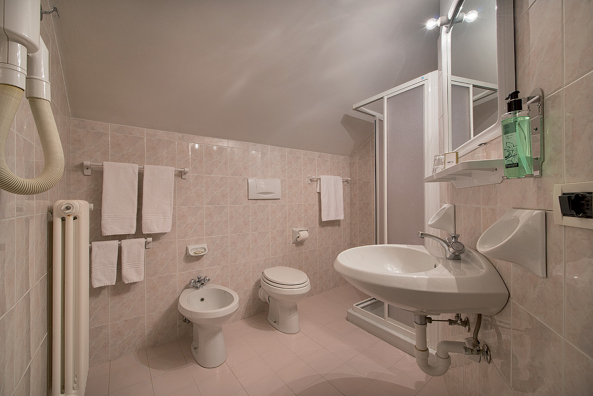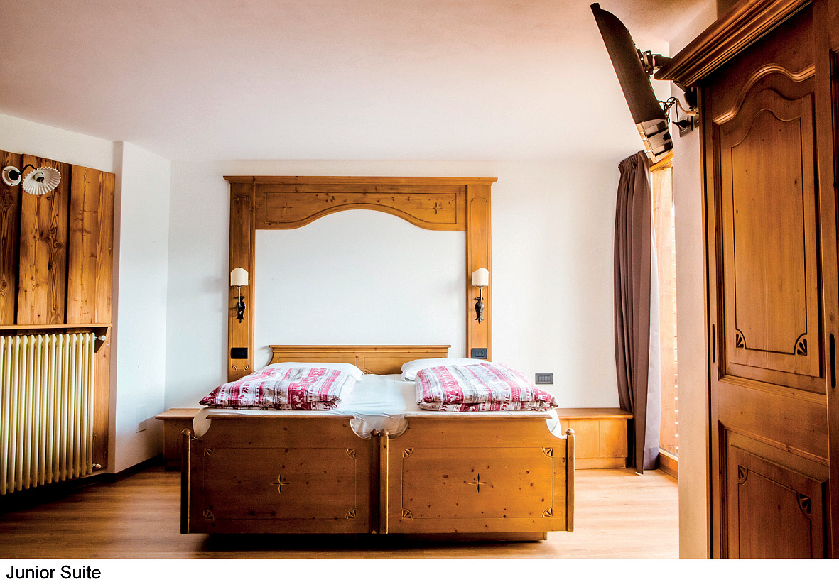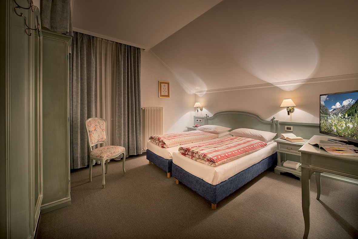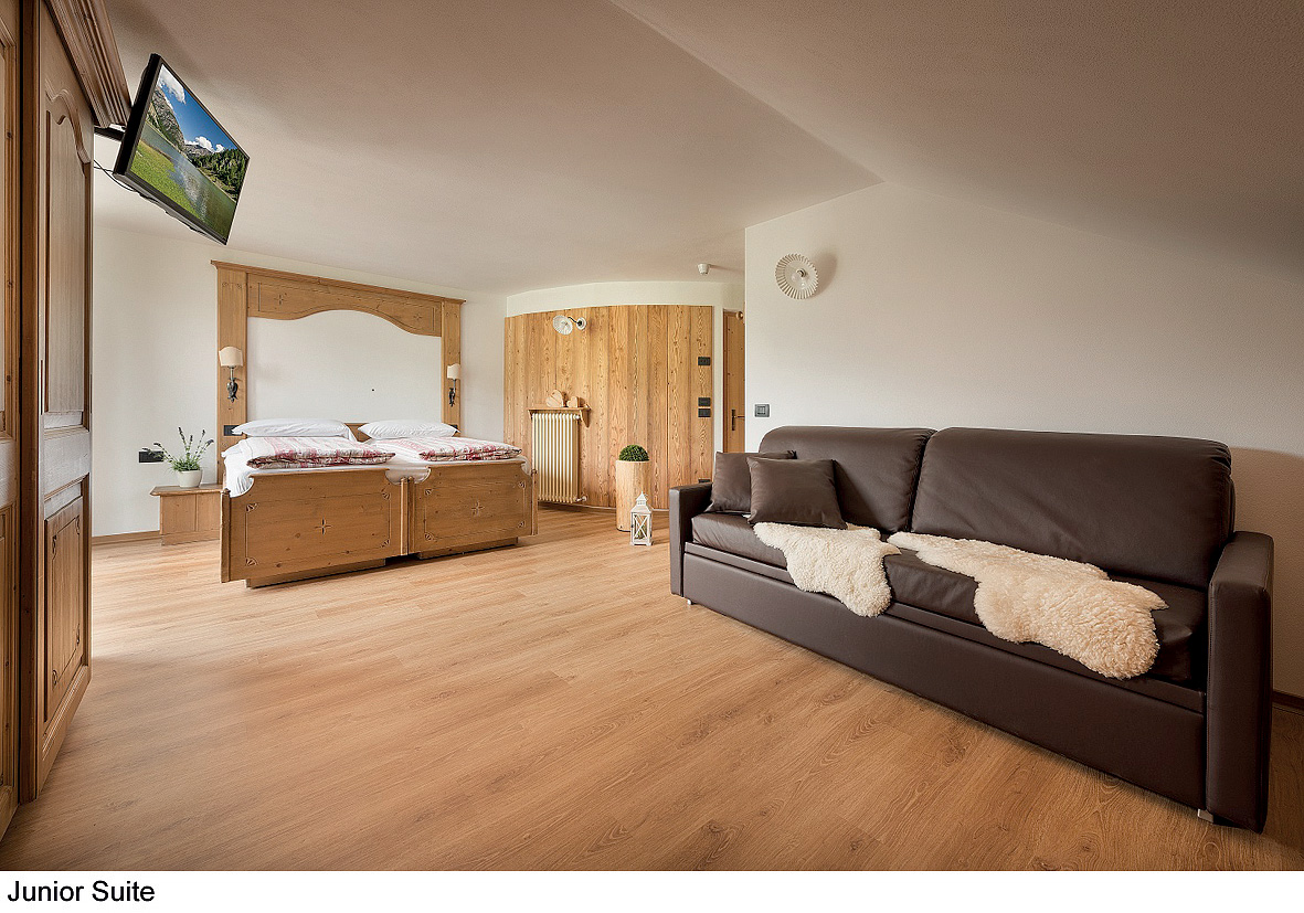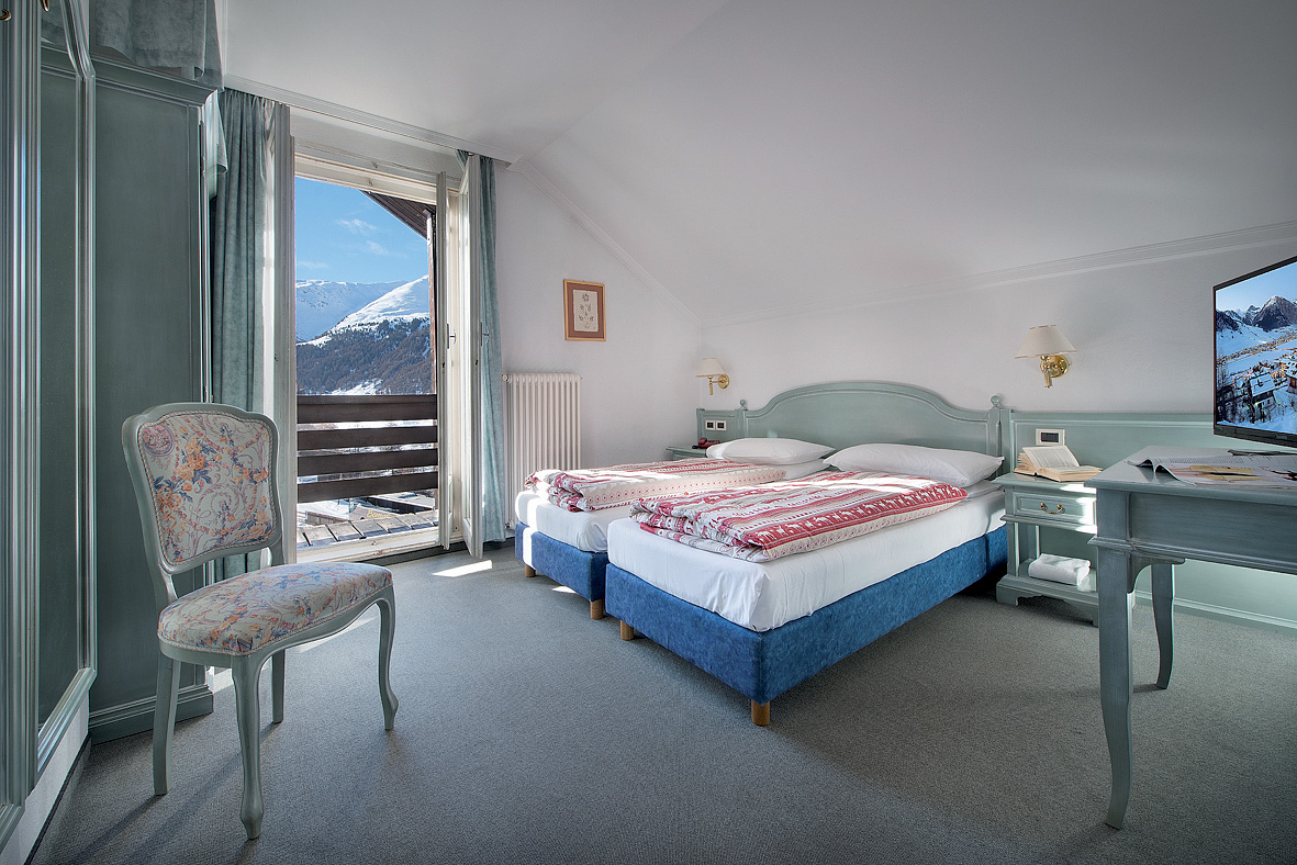 Sky Junior Suite 2/3/4 - 35 - 41 m² - pokoj s manželskou postelí či 2 samostatnými lůžky a rozkládacím gaučem pro 2 osoby, sociální zařízení se sprchou, balkon s výhledem do údolí Livigna; pokoj v nově postavené části hotelu