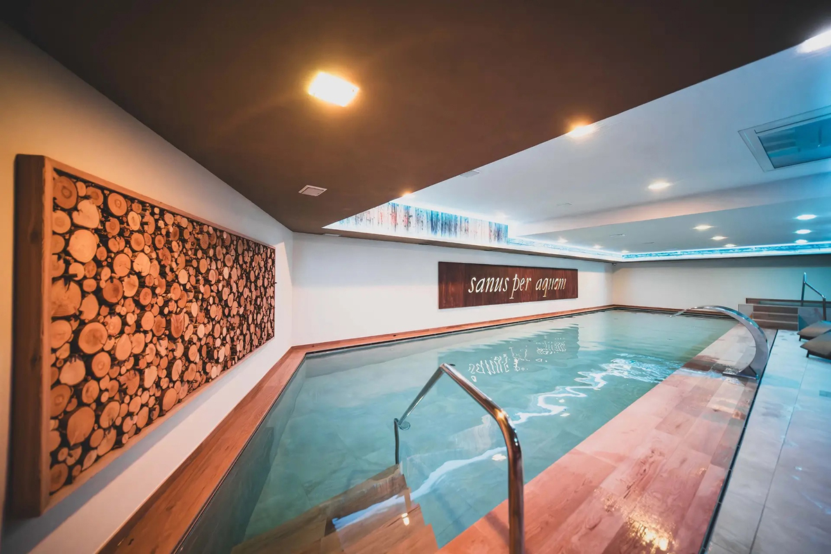 bazén 14 x 5 m, vířivka až pro 6 osob, finská sauna#, biosauna#, aromatická pára#, bazén s ledovou vodou#, multifunkční sprcha#, horské sluníčko#*, relaxační koutek s lehátky a bylinkovými čaji, masáže#*, kosmetické služby#*, posilovna#, stolní fotbal; služby označené#nemohou využívat děti do 14 let