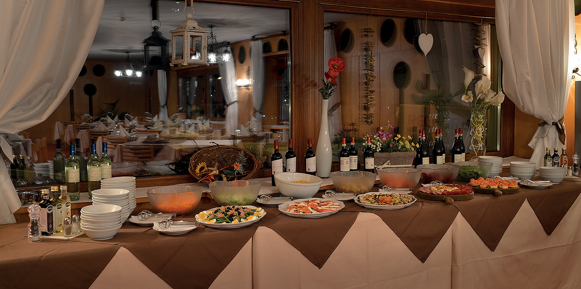 servírované menu s výběrem ze 3 teplých předkrmů 3 hlavních jídel s přílohou, studené předkrmy formou bufetu, menší salátový bufet, servírovaný dezert, nápoje za poplatek