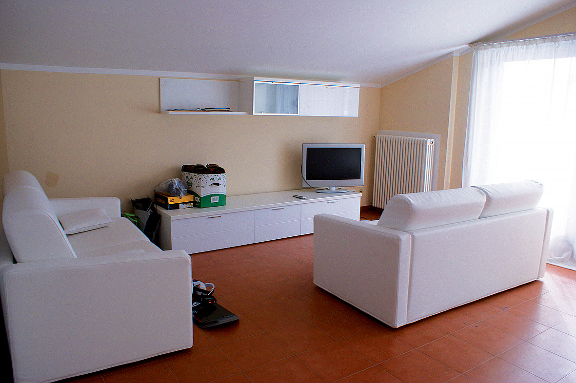 mono 6 - 90 m² - velmi prostorný obývací pokoj s kuchyňským koutem a sedací soupravou, skříní částečně oddělená ložnice se 4 samostatnými lůžky a rozkládacím gaučem pro 2 osoby, 2x sociální zařízení, balkon; bez garážového stání