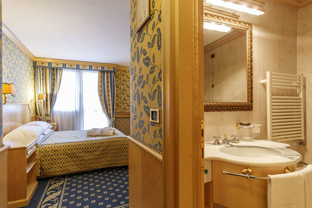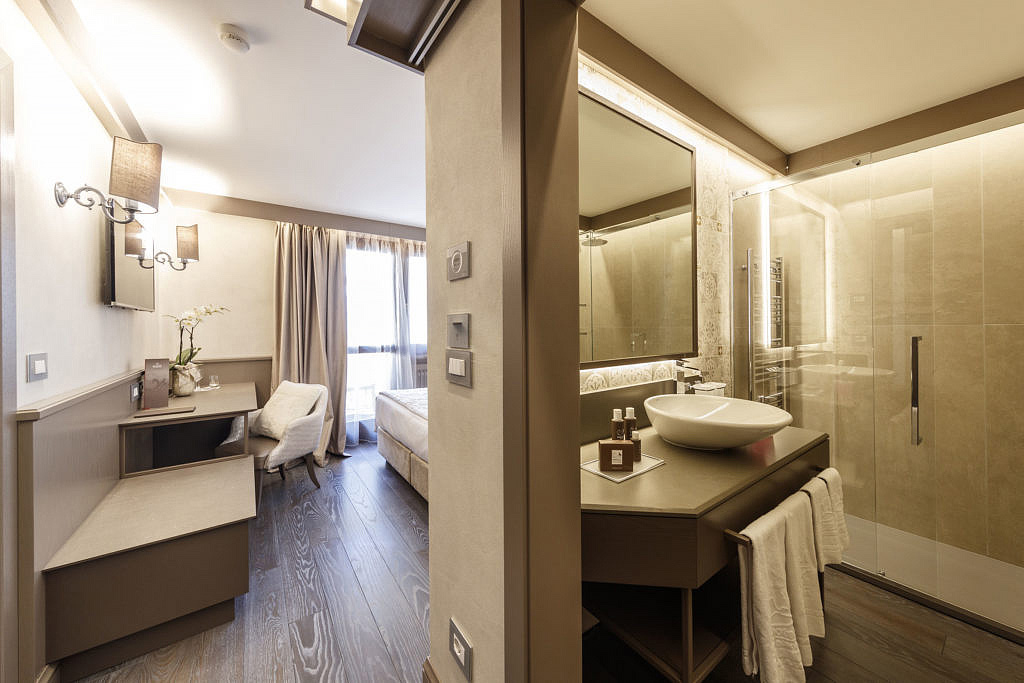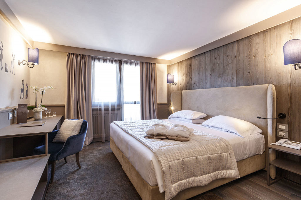 pokoj s manželskou postelí a případně 1 samostatným lůžkem, sociální zařízení, z 50% balkon či zimní zahrada; pokoj s výhledem na jezero či Monte Spinale