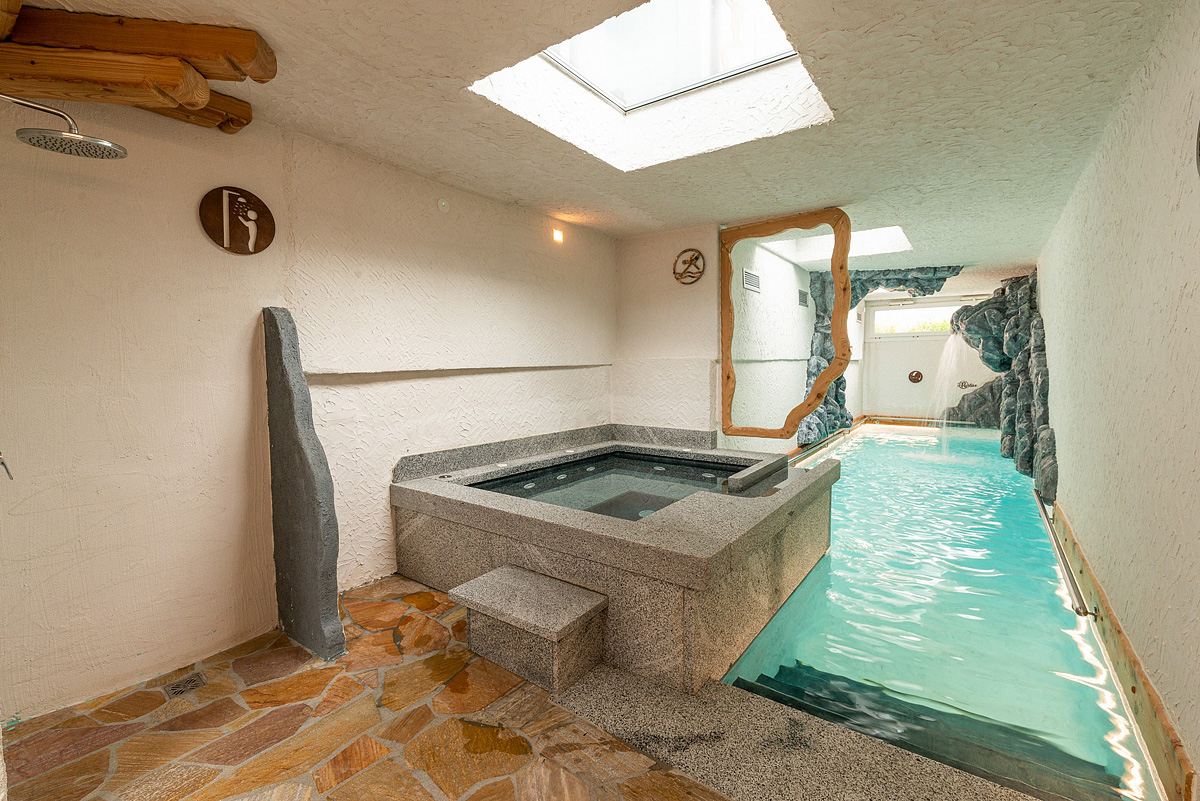menší bazén s umělým vodopádem, finská sauna#, bio sauna#, aromatické sprchy#, ledová jeskyně#, masáže*, relaxační zóna s lehátky#, kosmetické služby*; venkovní spa zóna: vířivka# až pro 4 osoby, sauna#; služby označené # mohou využívat děti až od 16 let