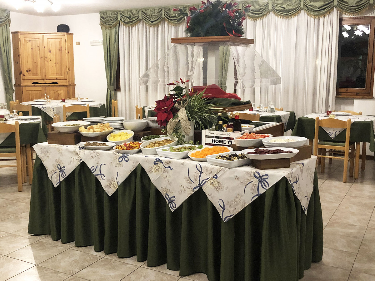 servírované menu: teplý předkrm a hlavní jídlo s přílohou, salátový bufet, servírovaný dezert či ovoce, nápoje za poplatek