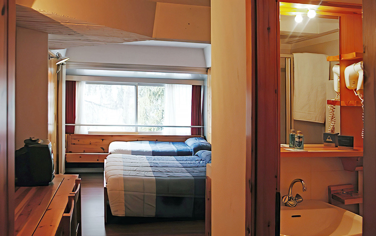 pokoj s manželskou postelí či 1 či 2 samostatnými lůžky a případně 1 dalším samostatným lůžkem, sociální zařízení zpravidla se sprchou, zřídka balkon