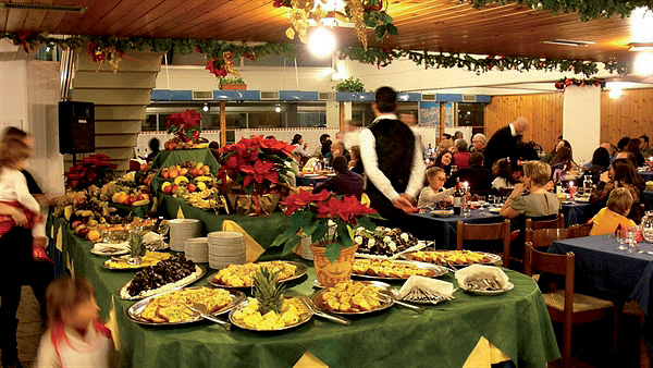 formou bufetu studených předkrmů, 3 teplých předkrmů, 3 hlavních jídel, příloh, salátů, zeleniny, dezert, nápoje za poplatek