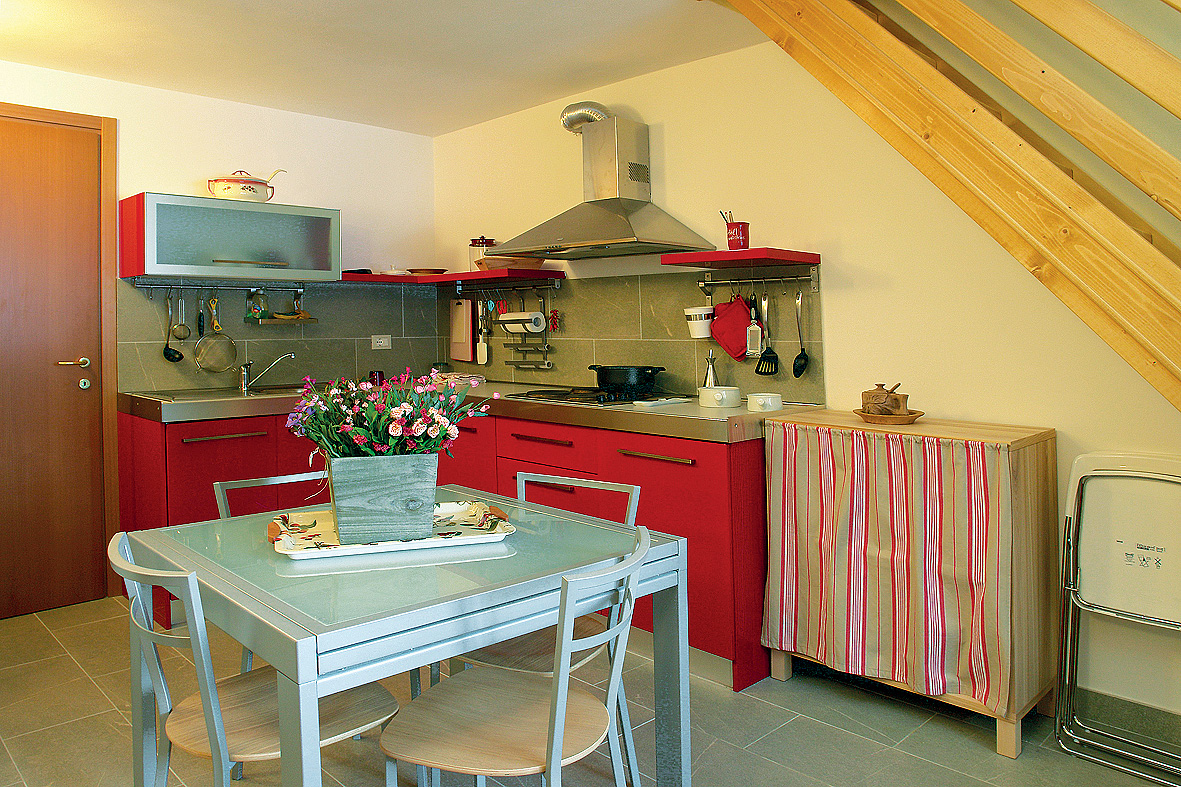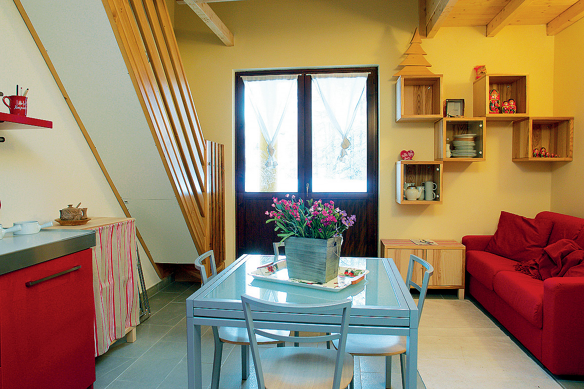 bilo 5/6 - 45 až 53 m² - 1 ložnice s manželskou postelí, obývací pokoj s kuchyňským koutem a rozkládacím gaučem pro 2 osoby či palandou, případné neuzavřené zvýšené patro v rámci obývacího pokoje s manželskou postelí a palandou, sociální zařízení, balkon či vstup na zahradu