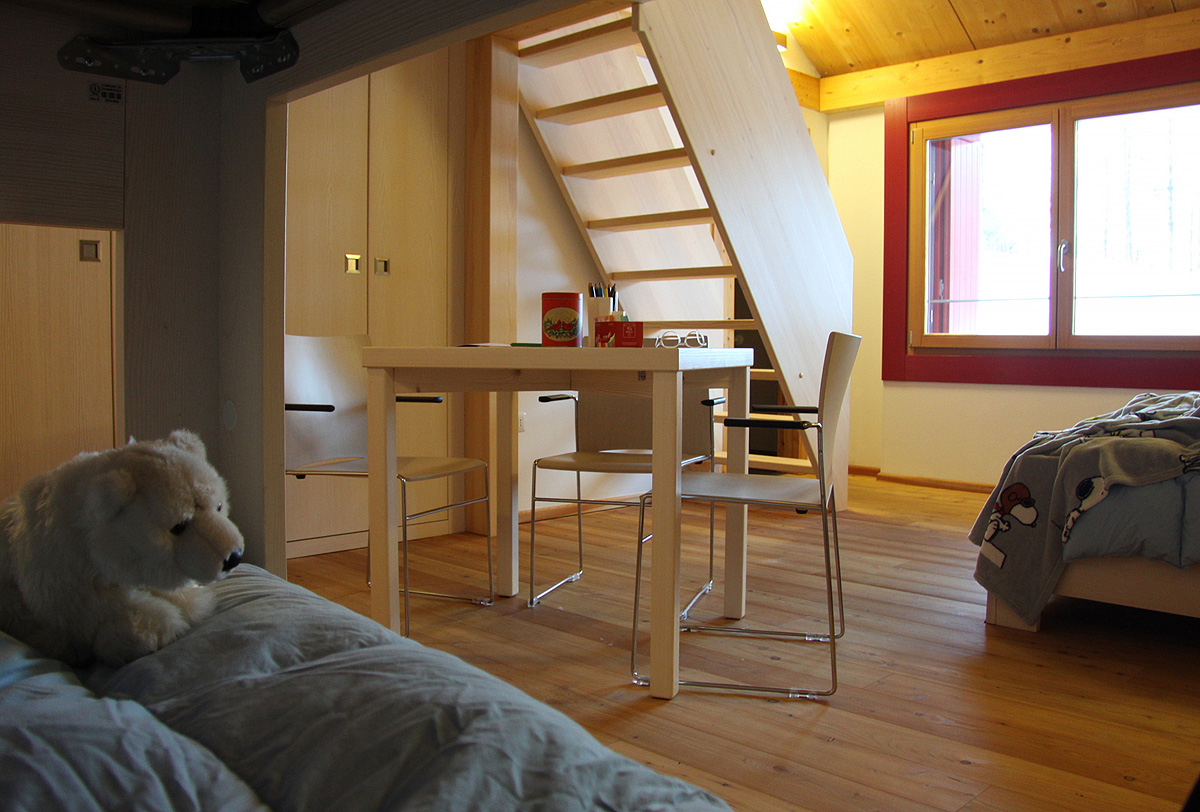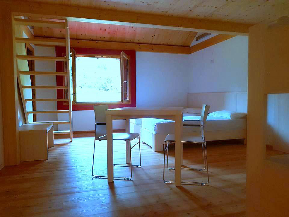 loft 6 - 44 m² - obývací pokoj s menším uzavíracím kuchyňským koutem, manželským lůžkem pro 2 osoby a palandou, neuzavřené mezipatro s 2 samostatnými lůžky či maželským lůžkem, sociální zařízení