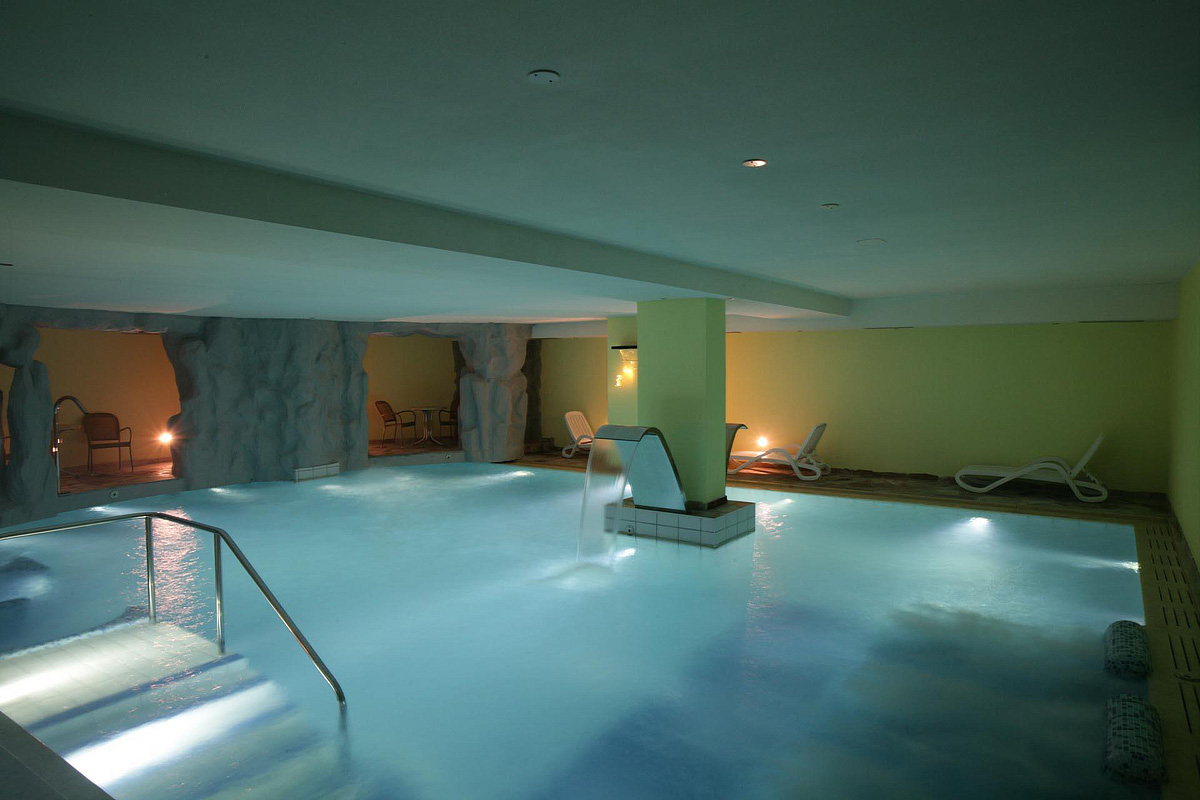 bazén 60 m² s umělým vodopádem a lehátky, vířivka# až pro 12 osob, sauna#, aromatická pára#, termárium#, ledová mlha#, multifunkční sprcha#, horizontální solárium#*, relaxační koutek# s lehátky, Kneippův chodník#, senná lázeň#*, masáže*, kosmetické služby*, posilovna, biliár*, stolní fotbal*; služby označené # mohou využívat děti až od 15 let