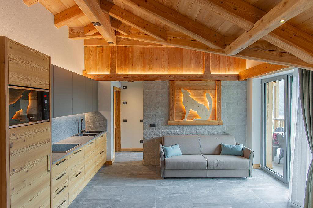 1 ložnice s manželskou postelí, 1 ložnice s manželskou postelí a 1 samostatným lůžkem, obývací pokoj s rozkládacím gaučem pro 2 osoby, částečně oddělená kuchyň či kuchyňský kout v rámci obývacího pokoje, sociální zařízení, terasa s panoramatickým výhledem