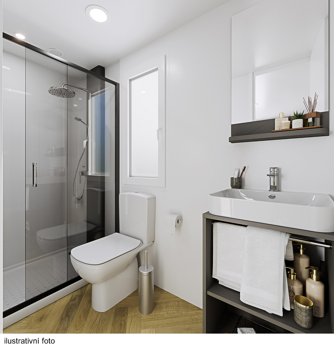 35 m² - 1 ložnice s manželskou postelí, 1 ložnice s palandou a případně 1 samostatným lůžkem, obytná kuchyň, sociální zařízení, terasa