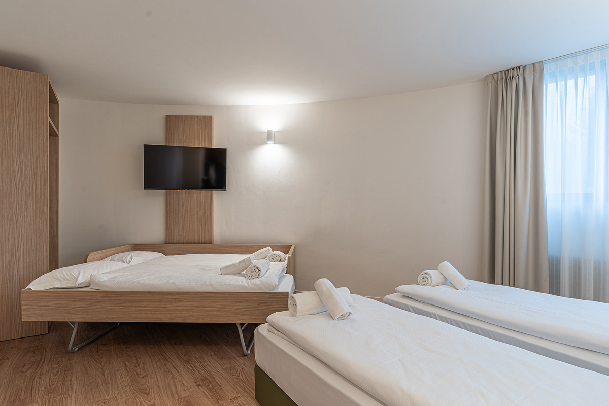 pokoj s manželskou postelí či 2 samostatnými lůžky a případně jedním samostatným lůžkem, pokoj s rozkládacím gaučem pro 2 osoby či palandou, sociální zařízení se sprchou, balkon