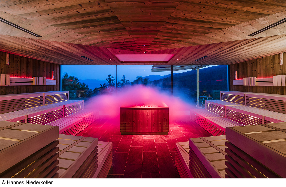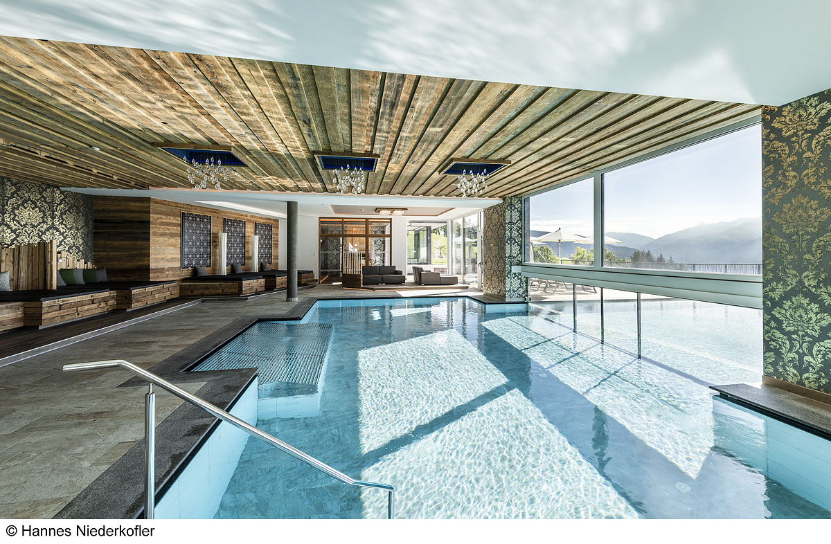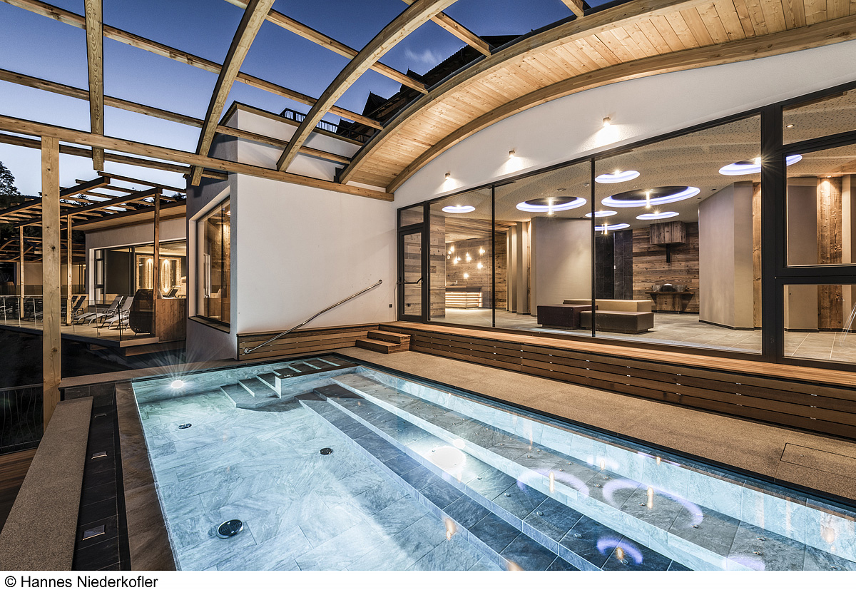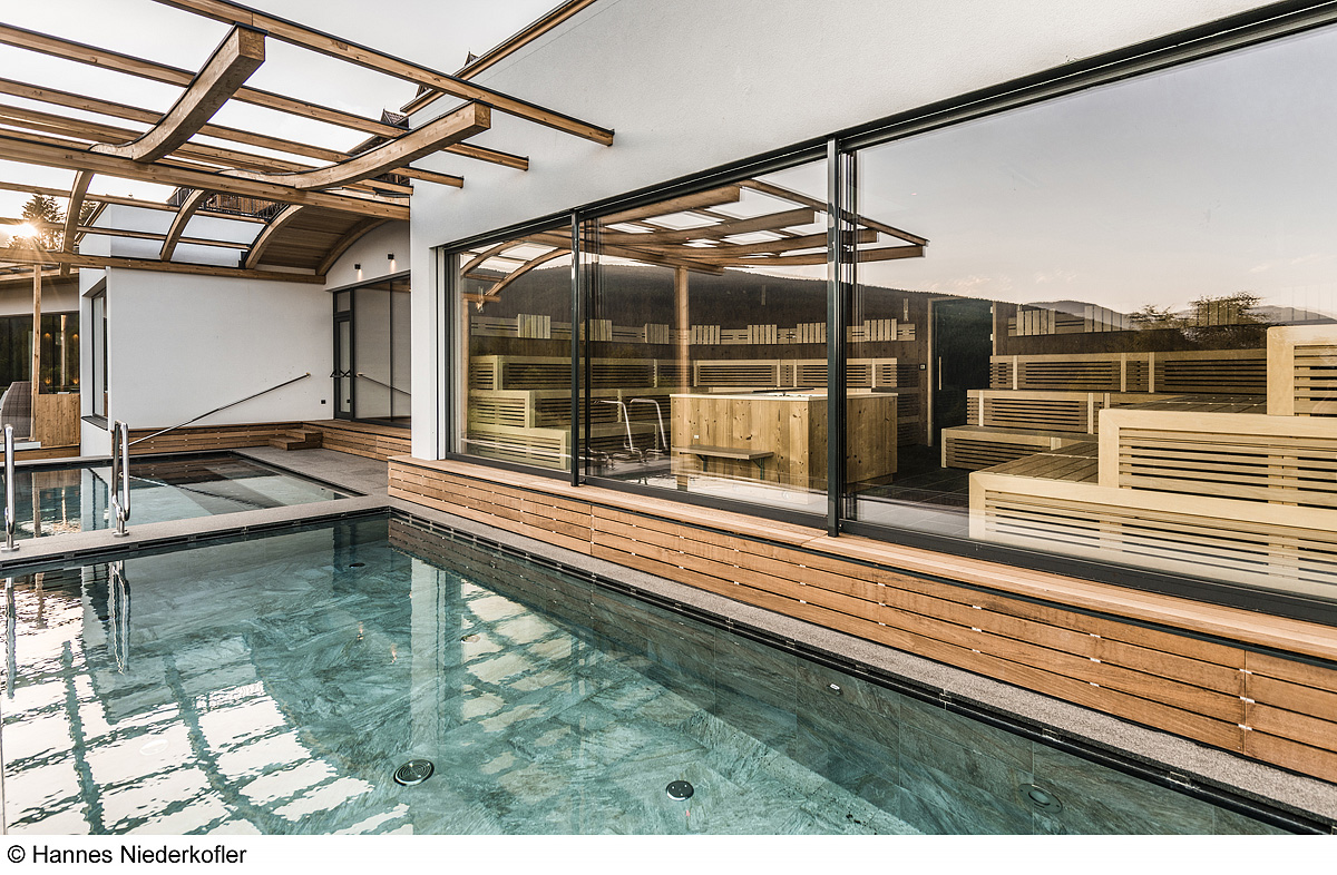 bazén 11 x 6 m, venkovní vyhřívaný bazén 18 x 8 m, dětský bazének, vířivka, finská sauna#, relaxační koutek s lehátky#, masáže*#, kosmetické služby*#; velká a nadstandardně vybavená posilovna, stolní tenis; služby označené # jsou dětem přístupné až od 15 let