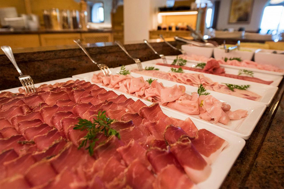 servírované menu s výběrem ze 2 až 3 teplých či studených předkrmů, 2 až 3 hlavních jídel s přílohou, salátový bufet, servírovaný dezert, nápoje za poplatek