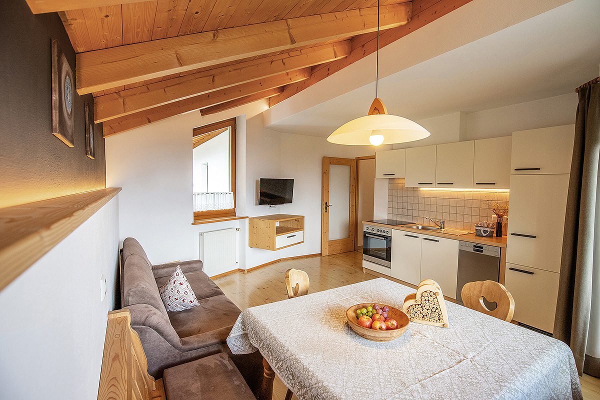 trilo 3/4 Theresia - 65 m² - 1 ložnice s manželskou postelí, 1 ložnice se 2 samostatnými lůžky, obývací pokoj s kuchyňským koutem, sociální zařízení se sprchou, balkon s výhledem; jedná se o podkrovní apartmán