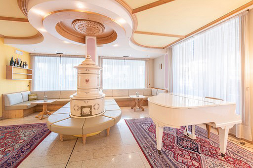 recepce / lobby s pecí a klavírem, bar, restaurace vyhrazená pro hotelové hosty, společenská místnost s pecí a klavírem, sluneční terasa, úschovna lyží a lyžařských bot, výtah, vyhrazené parkoviště, garážové stání (počet míst limitován)