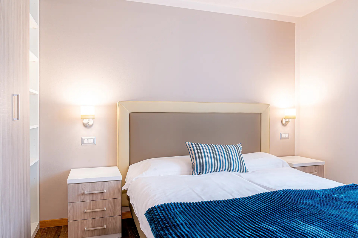 34 m² - 1 ložnice s manželskou postelí, obývací pokoj s kuchyňským koutem a rozkládacím gaučem pro 2 osoby, sociální zařízení se sprchou, velká terasa; apartmán se nachází v 1. patře