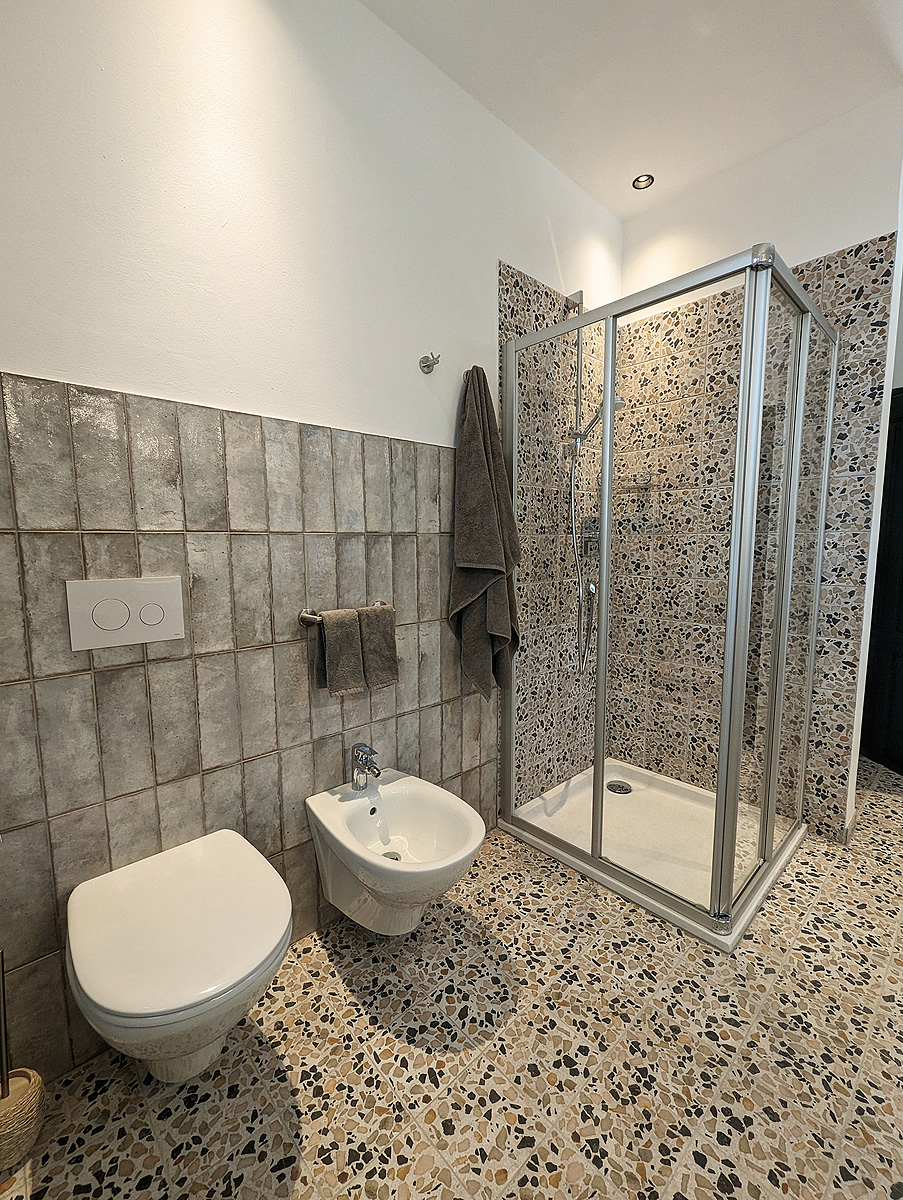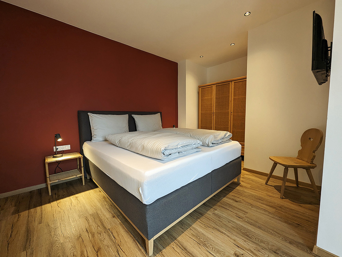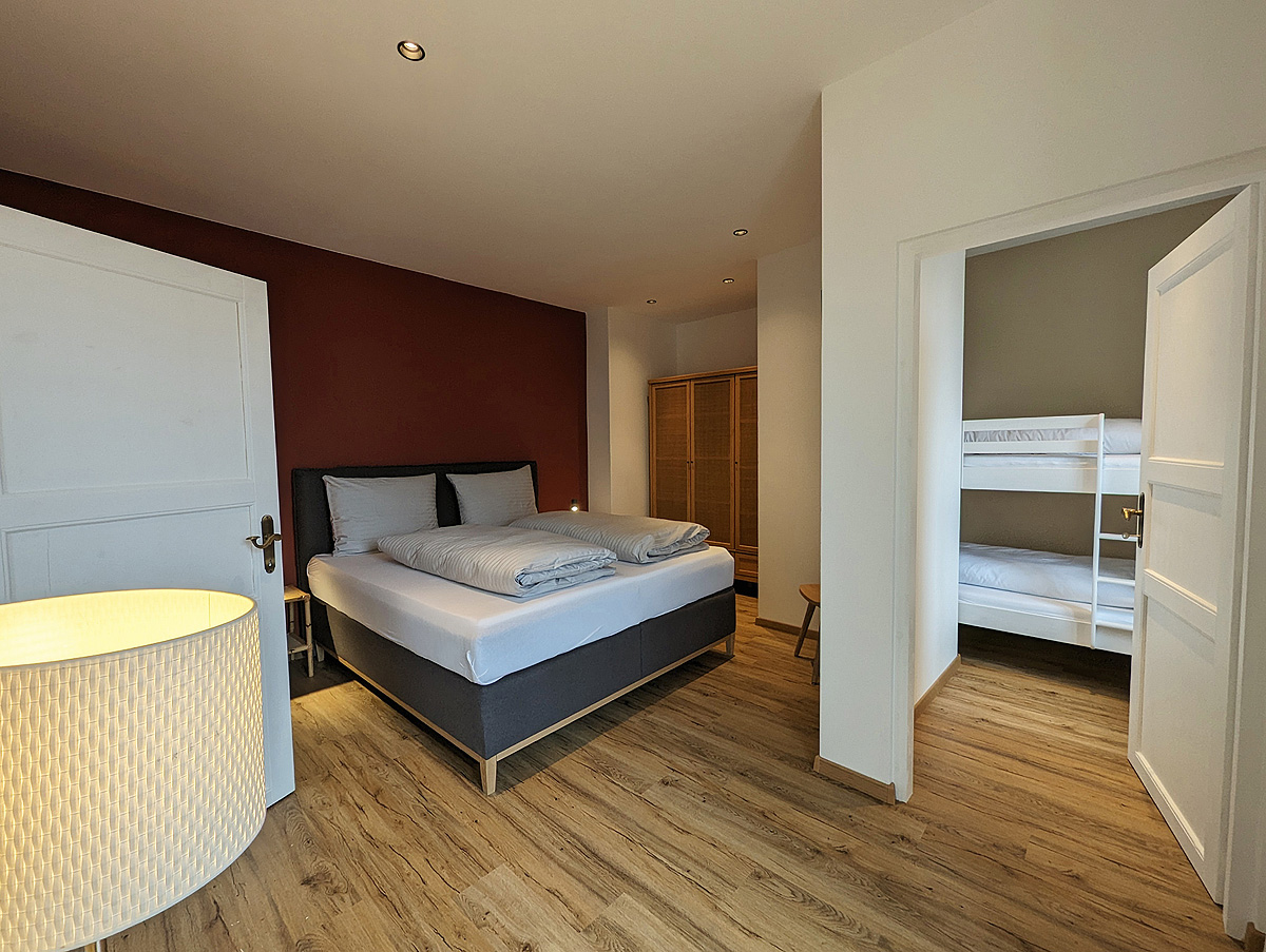 60 m² - 1 ložnice s manželskou postelí a odděleným malým prostorem s palandou pro 2 osoby, obývací pokoj s gaučem, kuchyň s jídelním stolem, prostorné sociální zařízení se sprchou, malý balkon; apartmán se nachází v samostatně stojící budově