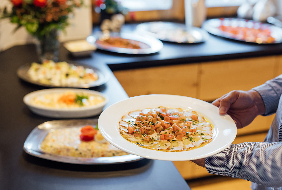 večeře - servírované menu s výběrem ze 2 hlavních jídel s přílohou, studené a teplé předkrmy, saláty a dezerty formou bufetu, nápoje za poplatek