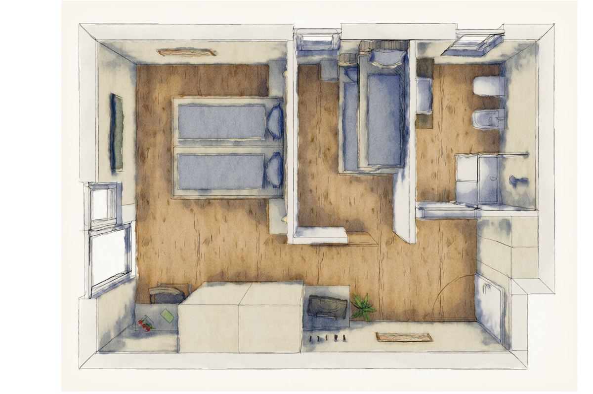 pokoj 2/3/4 - z 50 % balkon; 3. a 4. lůžka formou rozkládacího křesla na lůžko pro 1 osobu či rozkládacího gauče pro 2 osoby