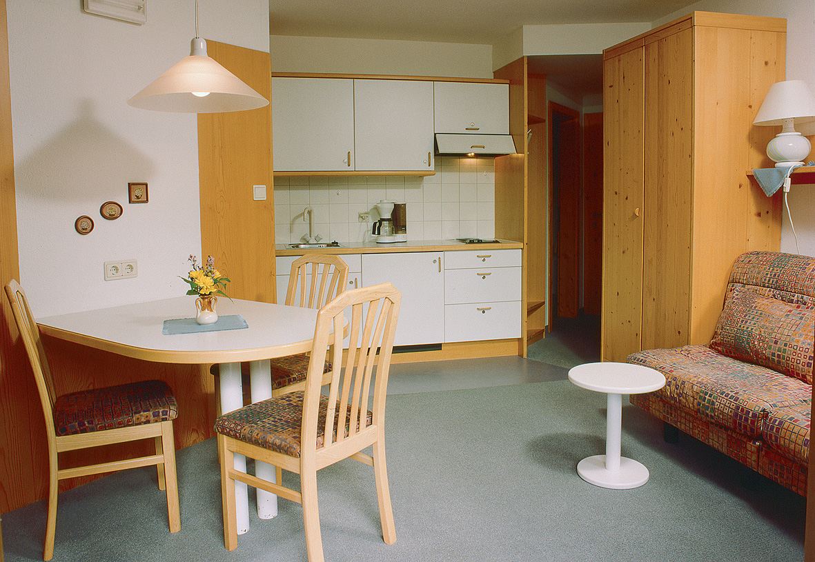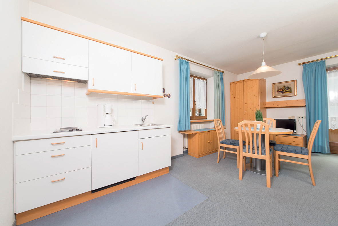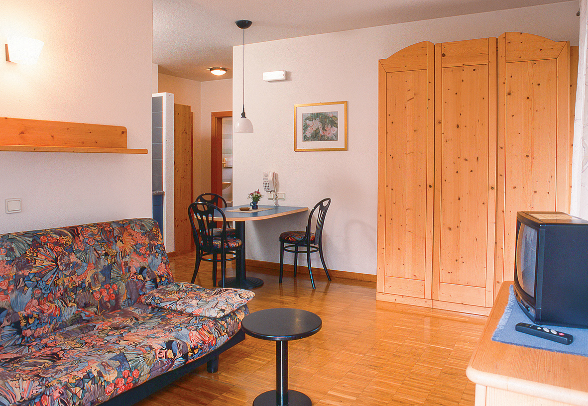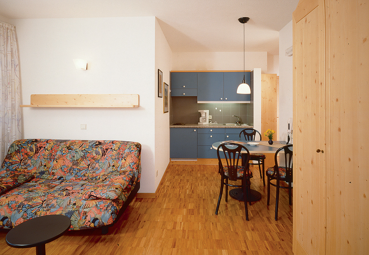 studio 4 - 30 m² - velmi malá ložnice s manželskou postelí oddělená zašupovacími dveřmi, obývací pokoj s kuchyňským koutem a rozkládacím gaučem pro 2 osoby, sociální zařízení, balkon či terasa