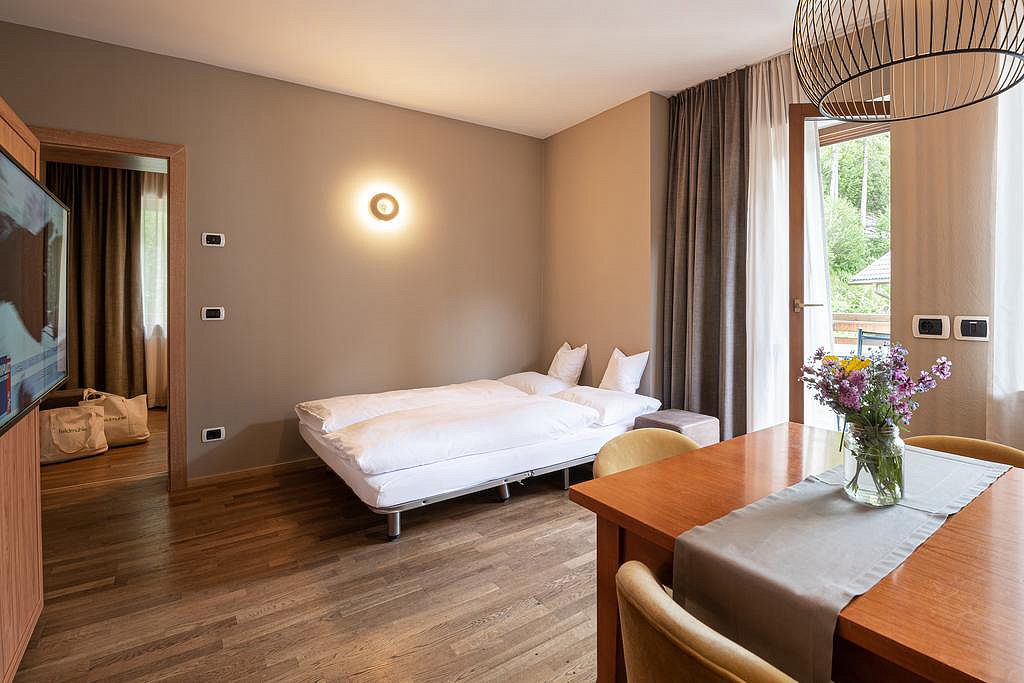 60 m² - 1 ložnice s manželskou postelí, obývací pokoj s rozkládacími gauči pro 2 osoby a 1 osobu, oddělitelný od zbytku místnosti posuvnou stěnou, samostatná kuchyň, sociální zařízení, balkon