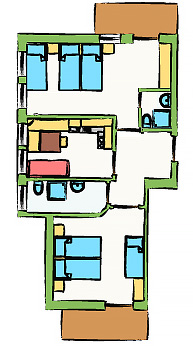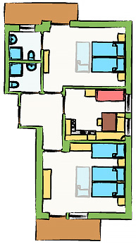 trilo 6 - 60 m² - 2 ložnice s manželskou postelí a rozkládacím gaučem pro 1 osobu či 1 přistýlkou, obytná kuchyň, 2x sociální zařízení, 2x balkon