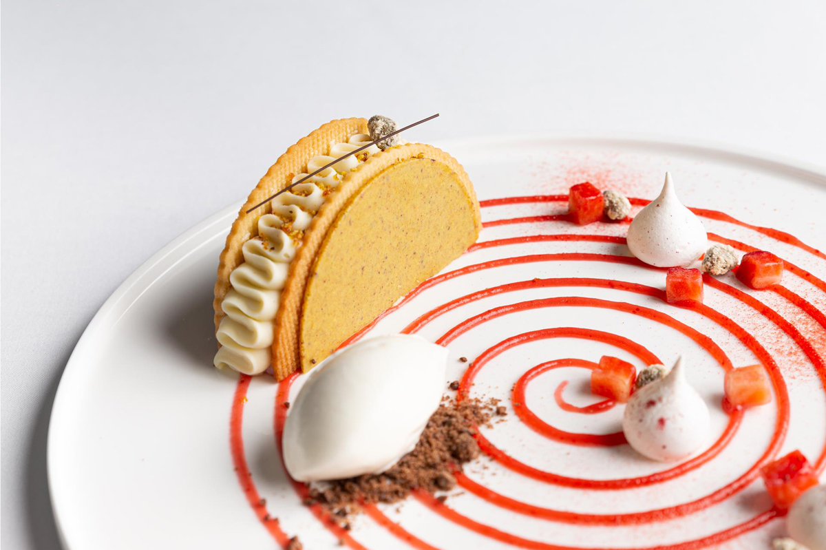 servírované menu s výběrem ze 2 až 3 teplých předkrmů a 2 až 3 hlavních jídel s přílohou, servírovaný dezert, salátový bufet, nápoje za poplatek