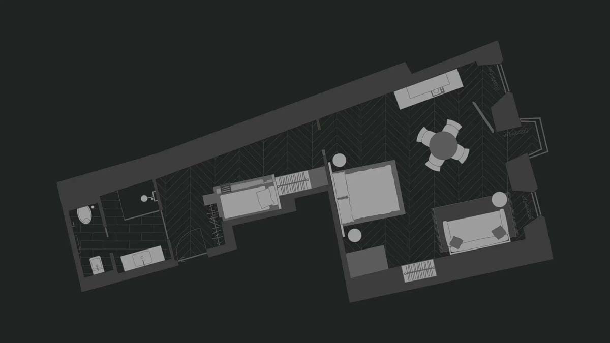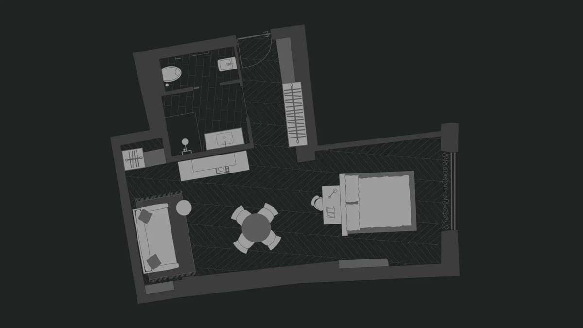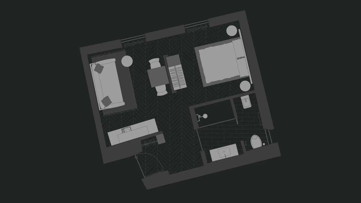 40 m² – obývací pokoj s kuchyňským koutem s částečně oddělenou manželskou postelí, sociální zařízení