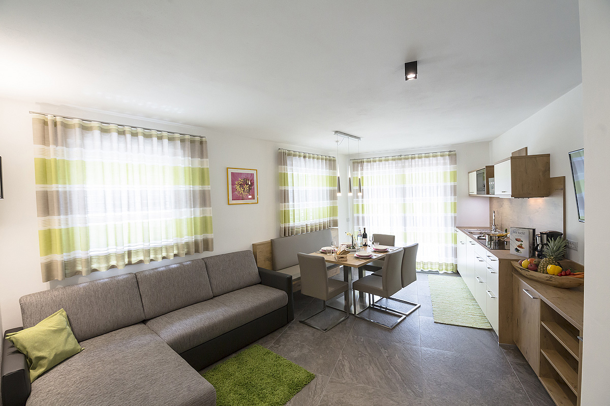 55 m² - 1 ložnice s manželskou postelí, 1 ložnice s palandou a vysouvacím lůžkem, obývací pokoj s kuchyňským koutem, sociální zařízení, terasa se vstupem na zahradu, maximální obsazenost apartmánu jsou 3 dospělé osoby a 3 děti do nedovršených 14 let