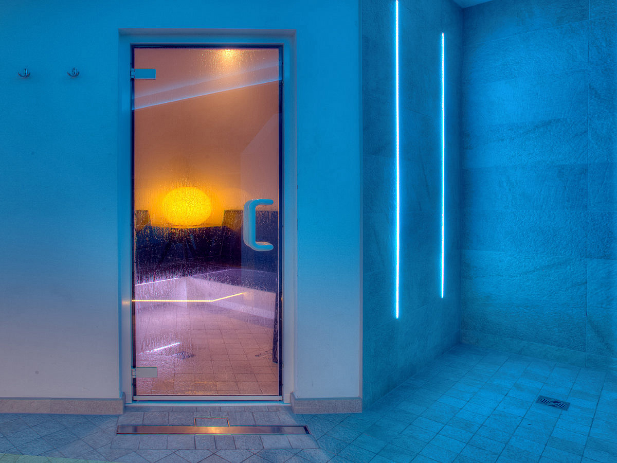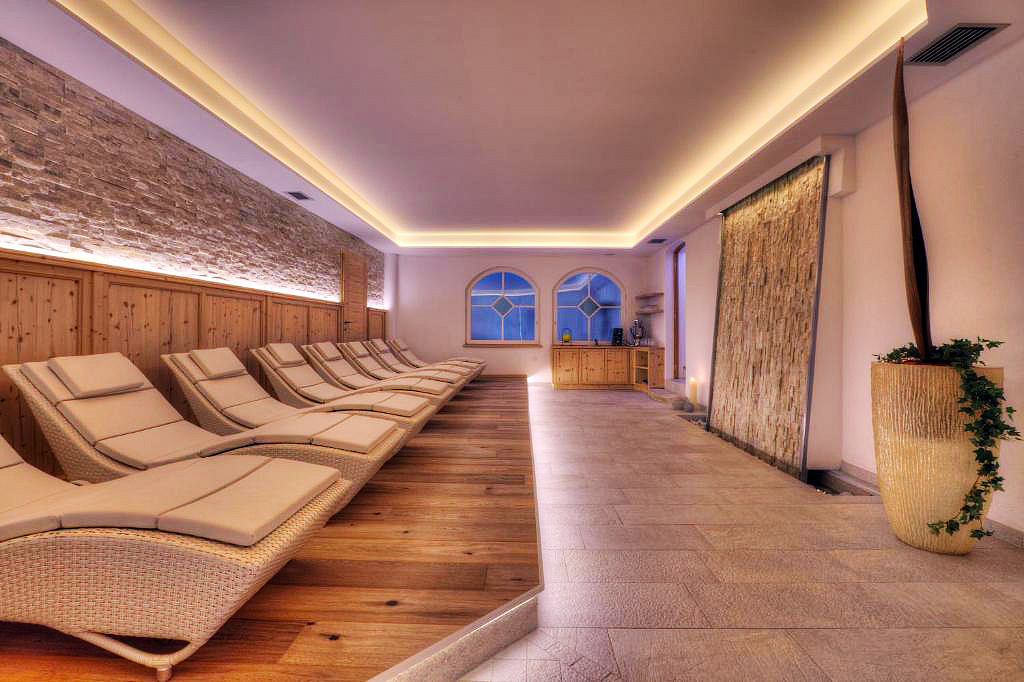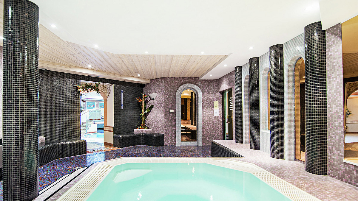 bazén 12 x 5 m s umělým vodopádem, vířivka# až pro 6 osob, finská sauna#, biosauna#, pára# , relaxační koutek# s lehátky; služby označené # mohou využívat děti do 16 let