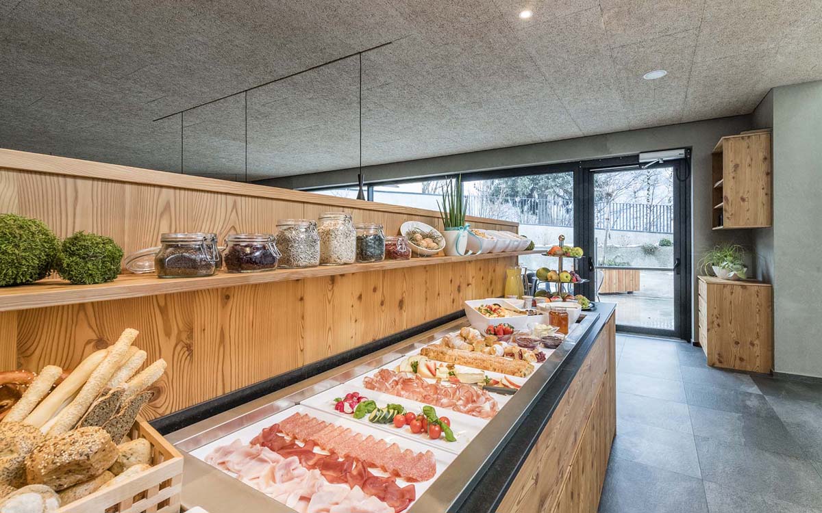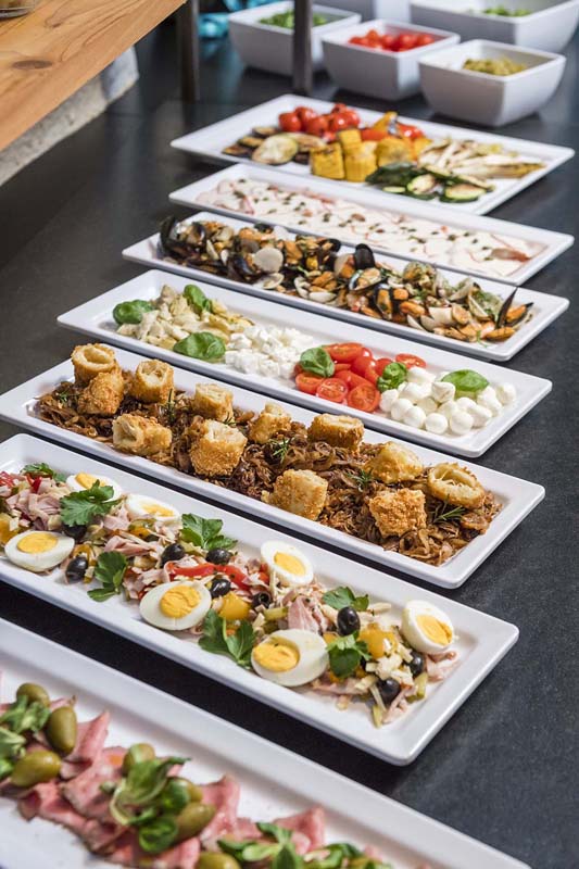 servírované menu s výběrem ze 2 teplých předkrmů, 2 hlavních jídel s přílohou a 3 dezertů, salátový bufet, nápoje za poplatek; k dispozici také dětské menu