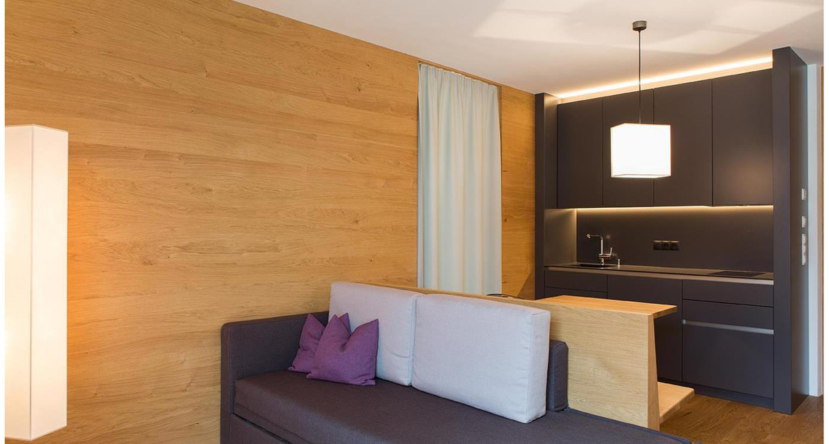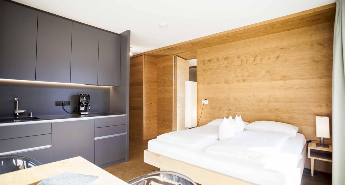 28 m² – pokoj s manželskou postelí a malým kuchyňským koutem, sociální zařízení se sprchou či vanou, balkon či terasa