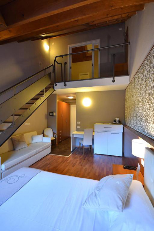 Suite 4/5/6 - pokoj s manželskou postelí či 2 samostatnými lůžky a případně 1 či 2 dalšími samostatnými lůžky, neuzavřené zvýšené patro s manželskou postelí či 2 samostatnými lůžky, sociální zařízení po rekonstrukci