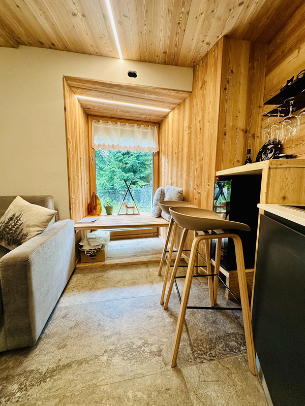 obývací pokoj s kuchyňským koutem, rozkládacím gaučem pro 2 osoby a rozkládaci palandou pro 1 či 2 osoby, sociální zařízení zpravidla se sprchou, balkon; maximální obsazenost apartmánu jsou 2 dospělé osoby a 2 děti do nedovršených 13 let