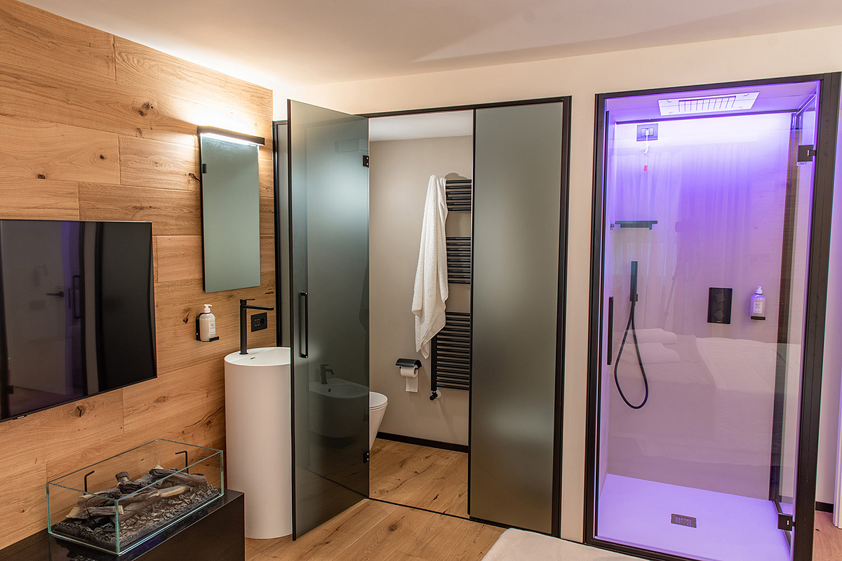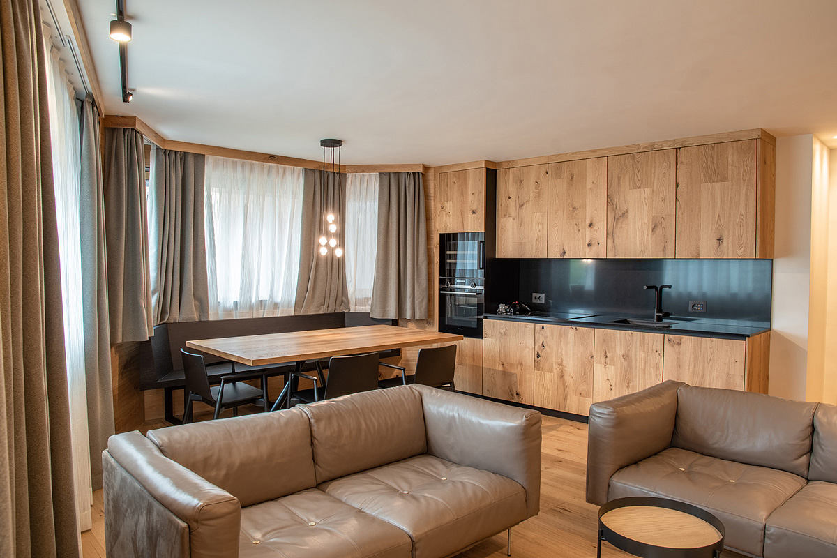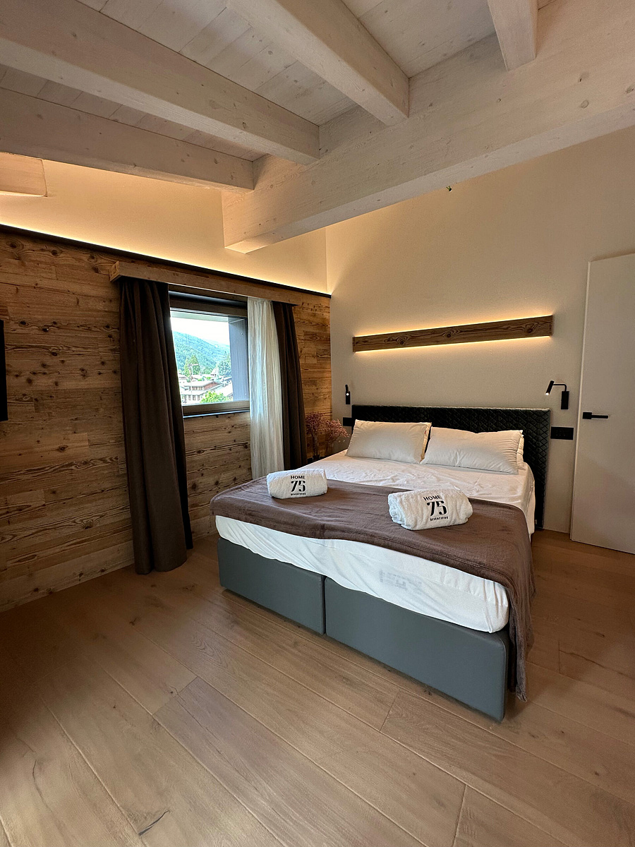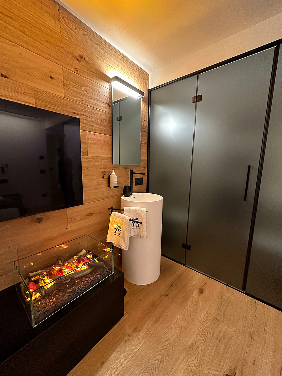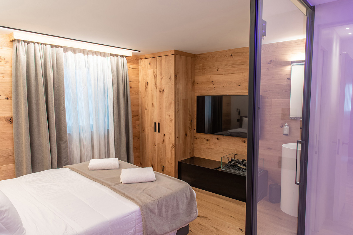 50 až 60 m² - 1 ložnice s manželskou postelí, obývací pokoj s kuchyňským koutem a rozkládacím gaučem pro 2 osoby, 2x sociální zařízení (1x s emoční sprchou), ve 2 apartmánech balkon, 1 podkrovní apartmán bez balkonu s interiérovou vanou a elektrickým krbem