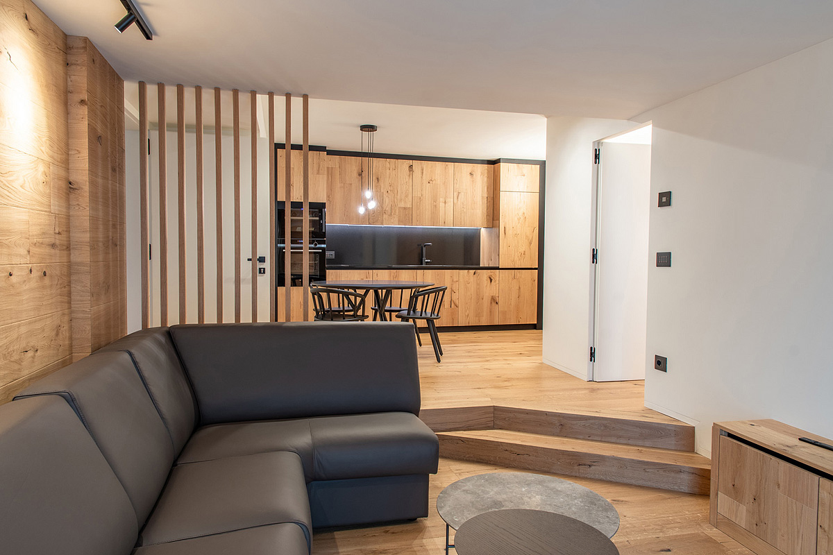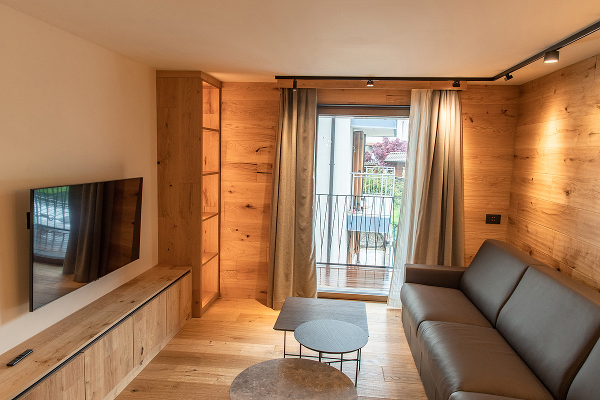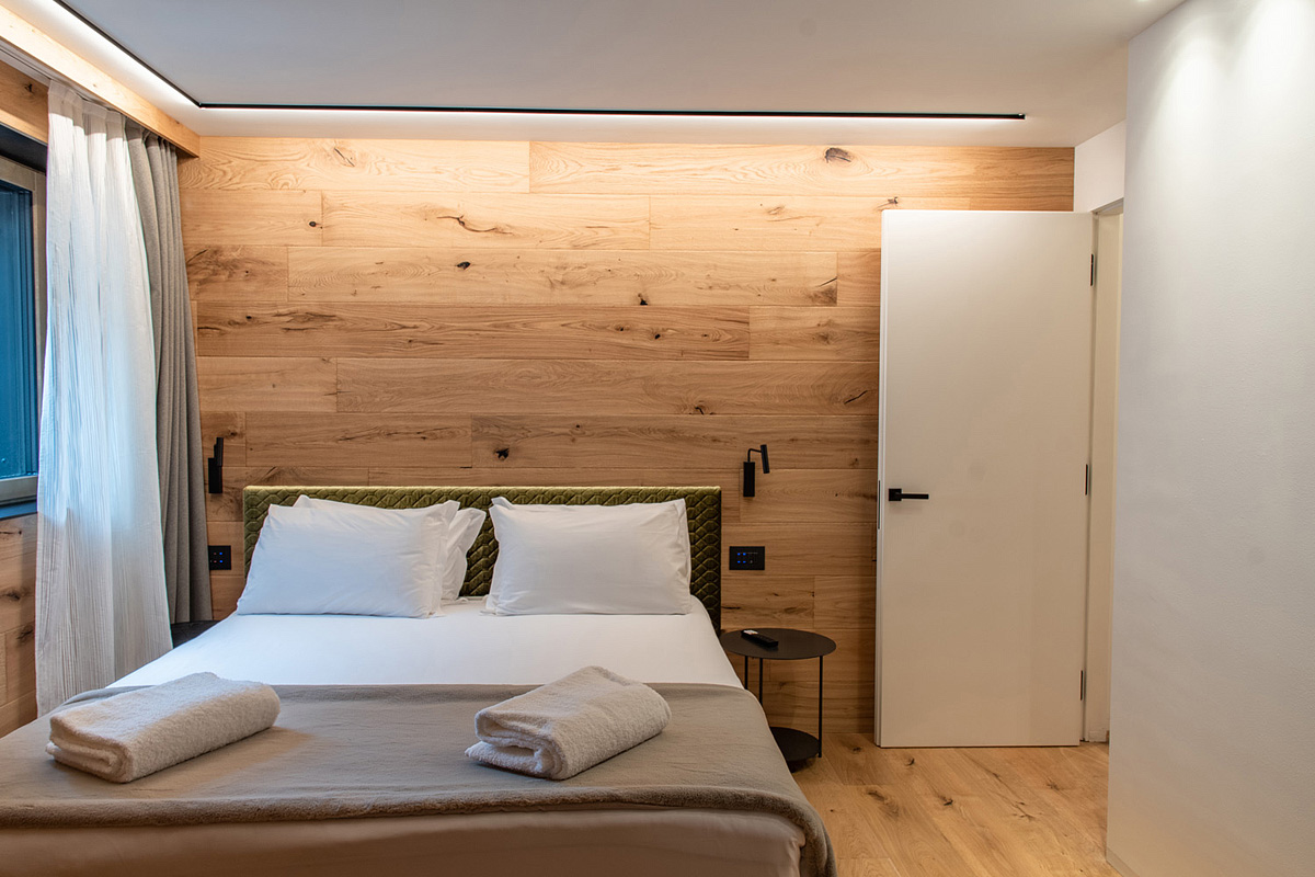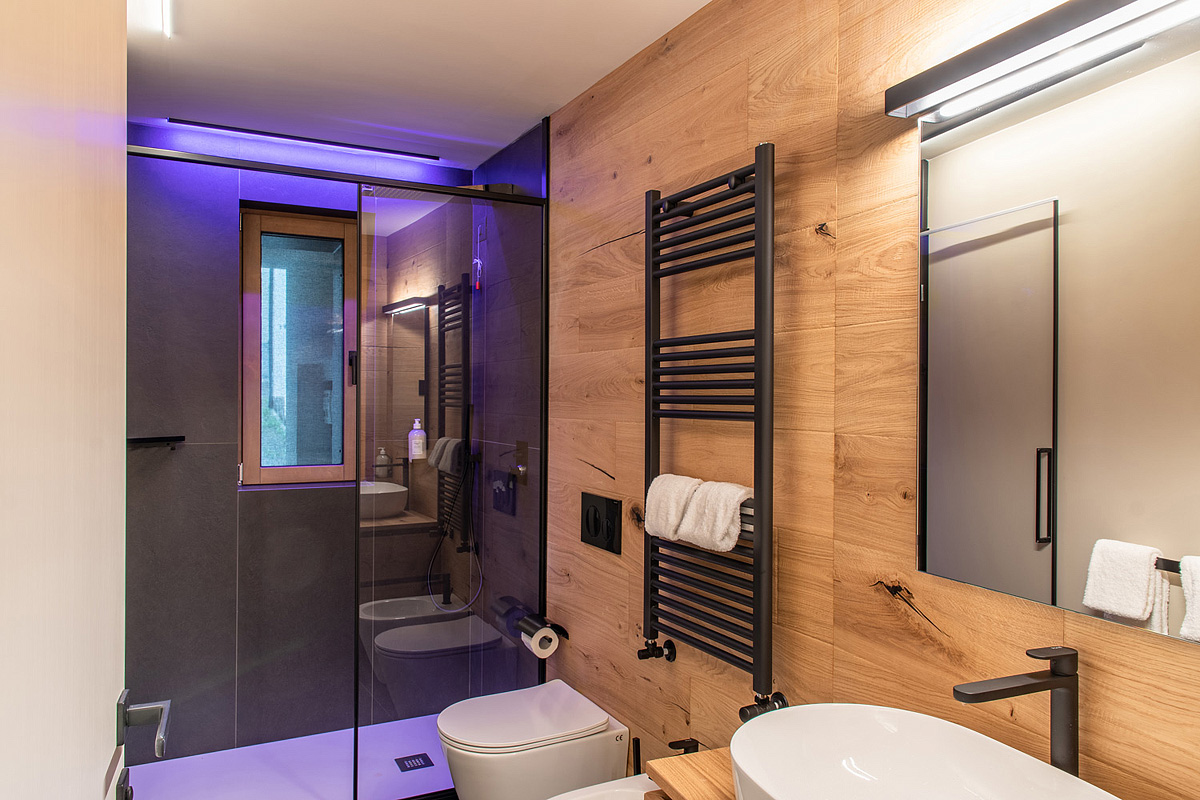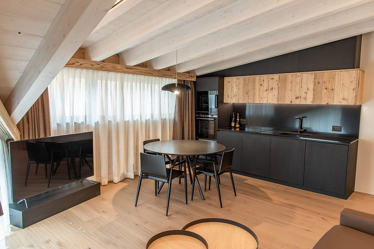 50 až 60 m² - 1 ložnice s manželskou postelí, obývací pokoj s kuchyňským koutem a rozkládacím gaučem pro 2 osoby, 2x sociální zařízení (1x s emoční sprchou), ve 2 apartmánech balkon, 1 podkrovní apartmán bez balkonu s interiérovou vanou a elektrickým krbem