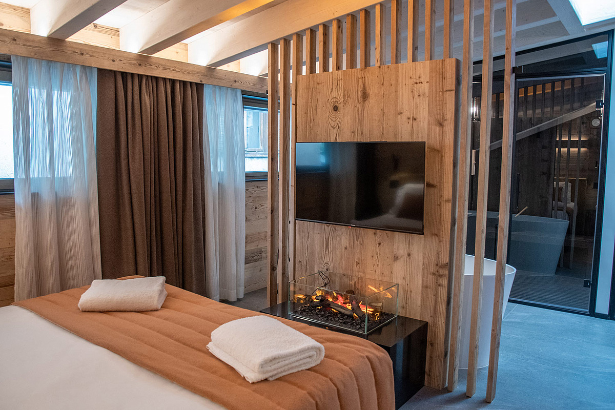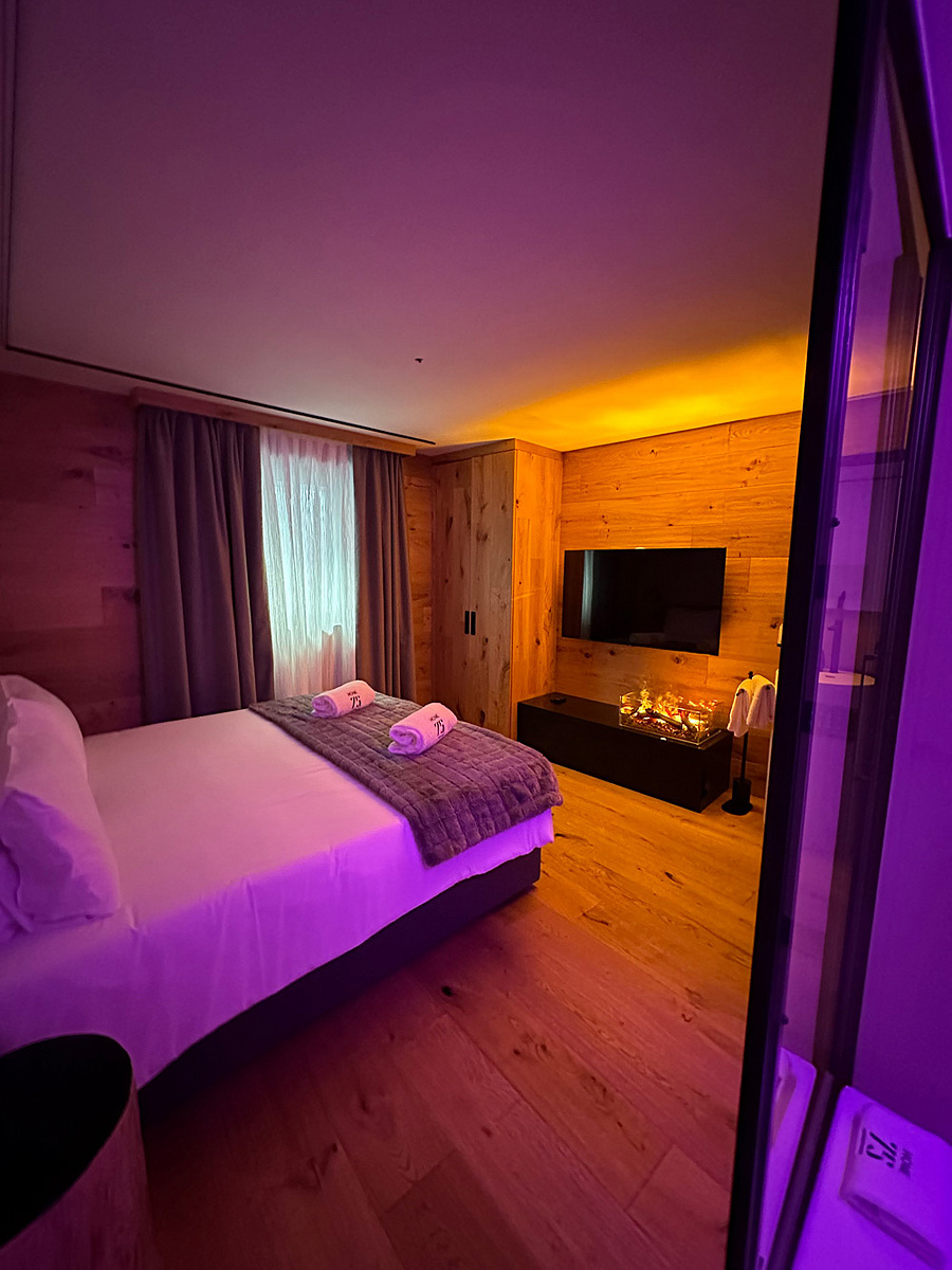 70 m² - 1 ložnice s manželskou postelí a elektrickým krbem, 1 ložnice se 2 samostatnými lůžky, prostorný obývací pokoj s kuchyňským koutem a panoramatickým výhledem, 2x sociální zařízení s emoční sprchou