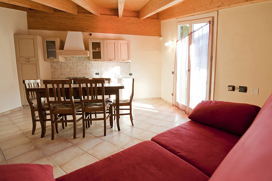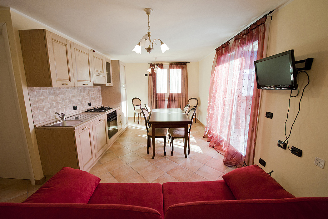 50 m² - 1 ložnice s manželskou postelí, obývací pokoj s kuchyňským koutem a rozkládacím gaučem pro 2 osoby (možno i typ "šuplík"), sociální zařízení, balkon