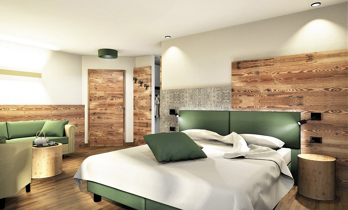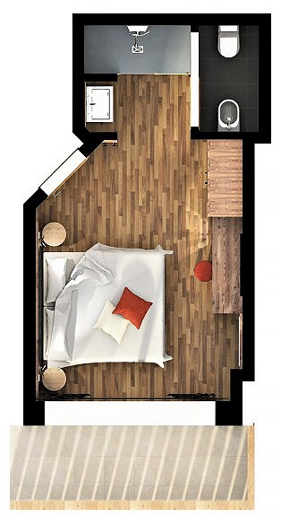 28 m² - pokoj s manželskou postelí a případně rozkládacím gaučem pro 1 či 2 osoby, sociální zařízení, balkon; pokoje mohou být odděleny jen částečně stěnou