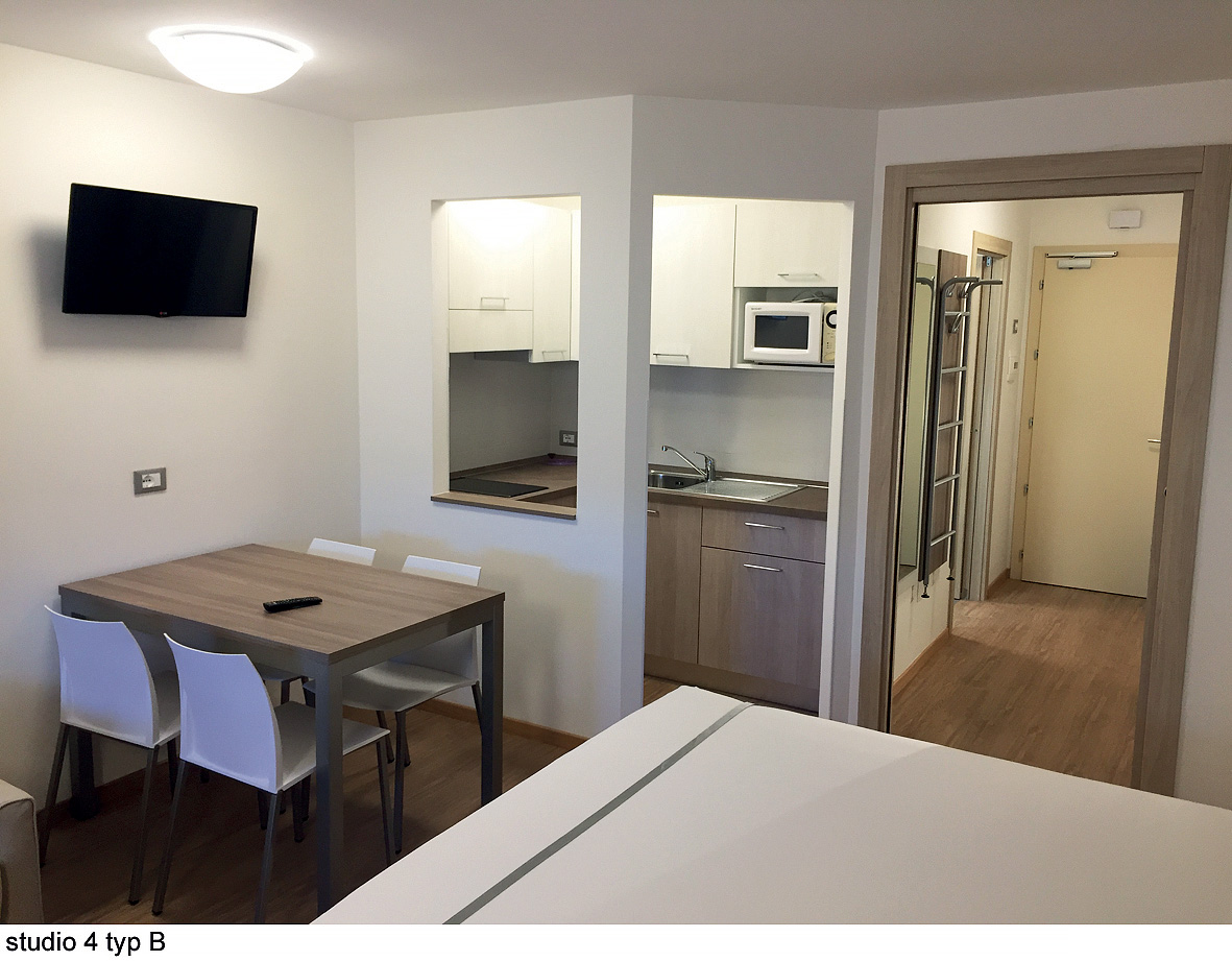 studio 3 - 30 m² - obývací pokoj s odděleným kuchyňským koutem a manželskou postelí či skříňovou manželskou postelí, vstupní místnost s 1 samostatným lůžkem, sociální zařízení, balkon či terasa