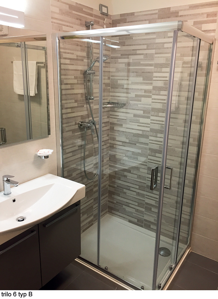 trilo 6 - 45 m² - 1 ložnice s manželskou postelí, 1 ložnice se 2 samostatnými lůžky, obývací pokoj s odděleným kuchyňským koutem a rozkládacím gaučem pro 2 osoby, sociální zařízení, balkon; apartmány jsou situovány v podkroví; trila 6 sud s výhledem do údolí