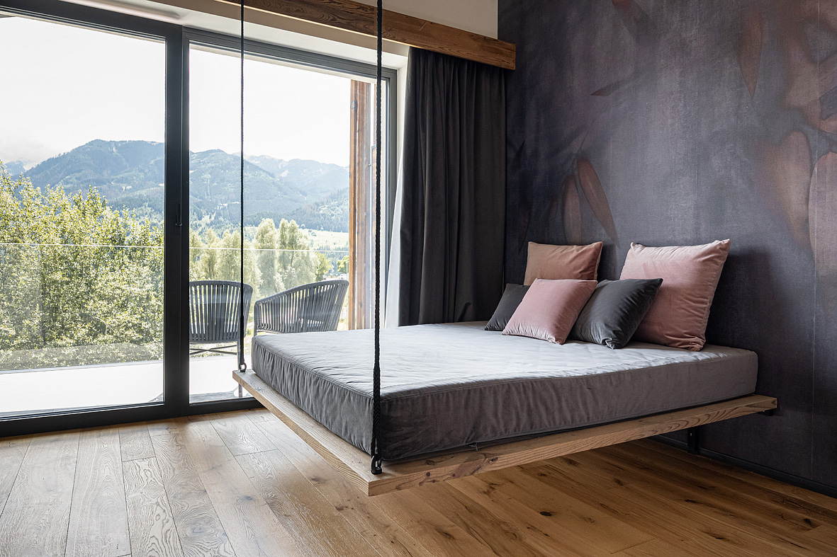 38 až 42 m² - pokoj s manželskou postelí a případně 1 samostatným lůžkem či rozkládacím gaučem na lůžko pro 1 osobu, privátní sauna, sociální zařízení, balkon